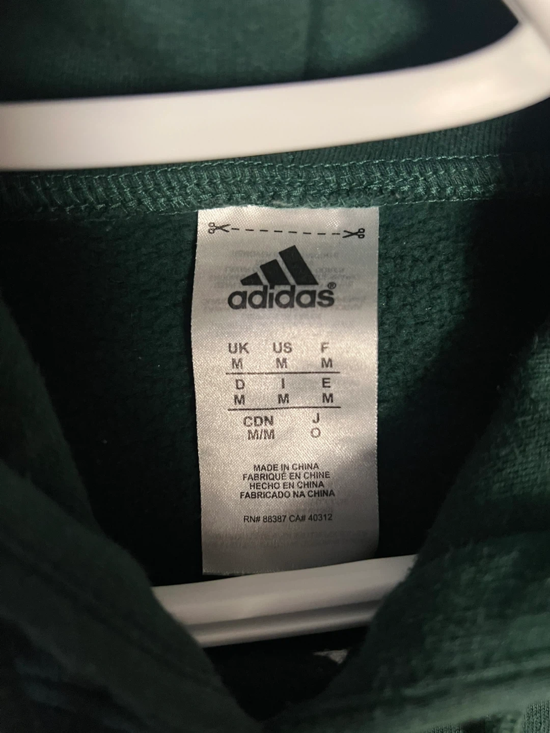 Selling a comfy Adidas hoodie in a nice dark green colour. In very good condition, no stains or tears. It's a size medium and has a cuffed fit around the wrist and waist.