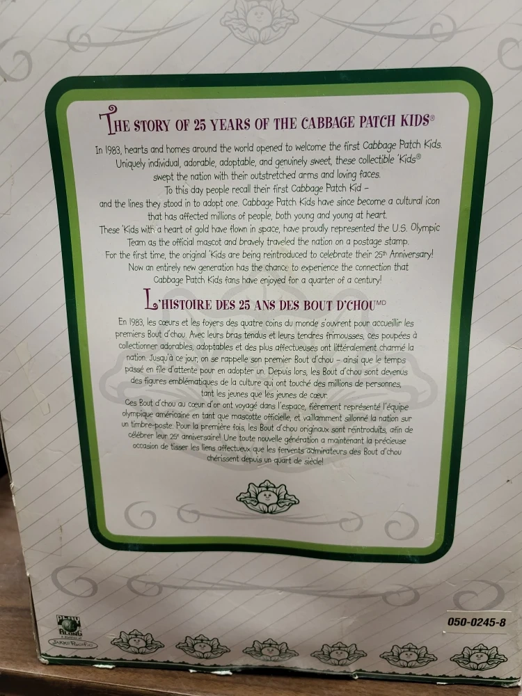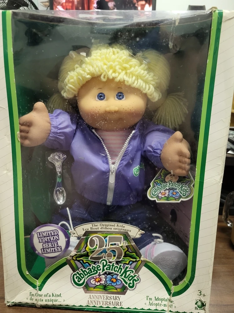 Selling a brand new, in-box Cabbage Patch Kids 25th Anniversary doll! This is a limited edition collectible, perfect for any Cabbage Patch Kids fan or doll collector. The box includes the original doll and adoption papers