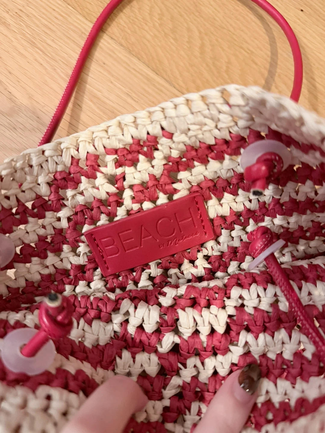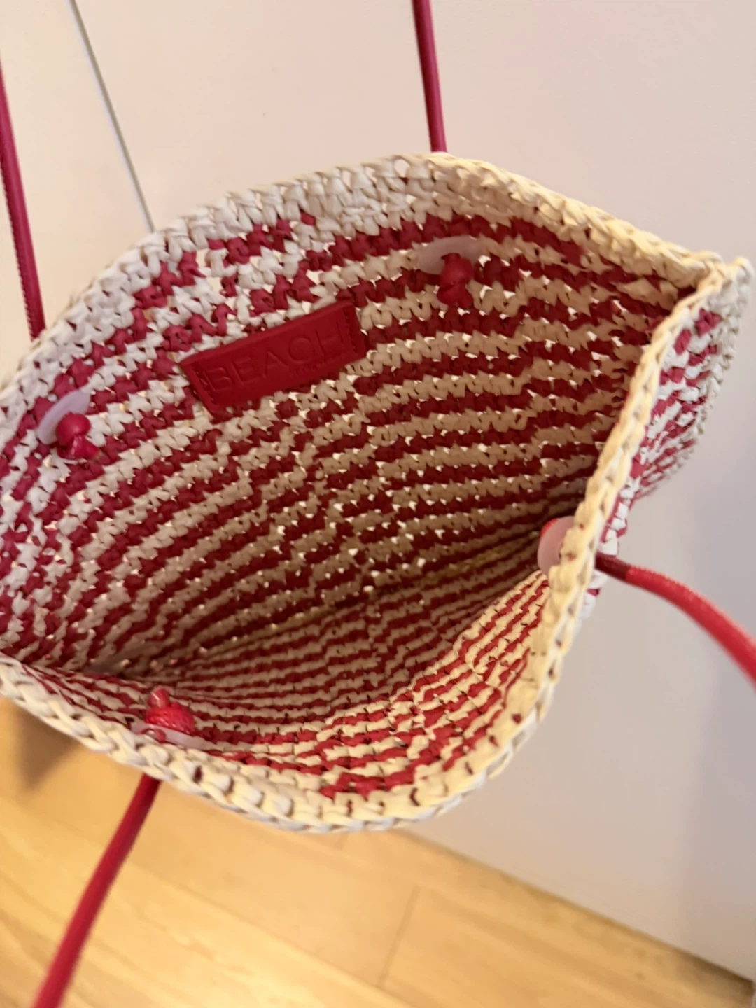 Selling a BEACH by Matisse woven tote bag. It features a red and white striped design with red handles. The bag is in great condition and ready for a new owner!
