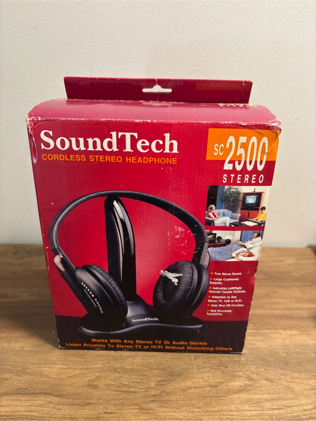 Selling a SoundTech SC2500 cordless stereo headphone. It comes with the original box and owner's manual. This cordless stereo system uses the same technology as your TV's remote control, converting audio to invisible infrared light waves for clear reception. It's ideal for both kids and adults, especially those with hearing impairments