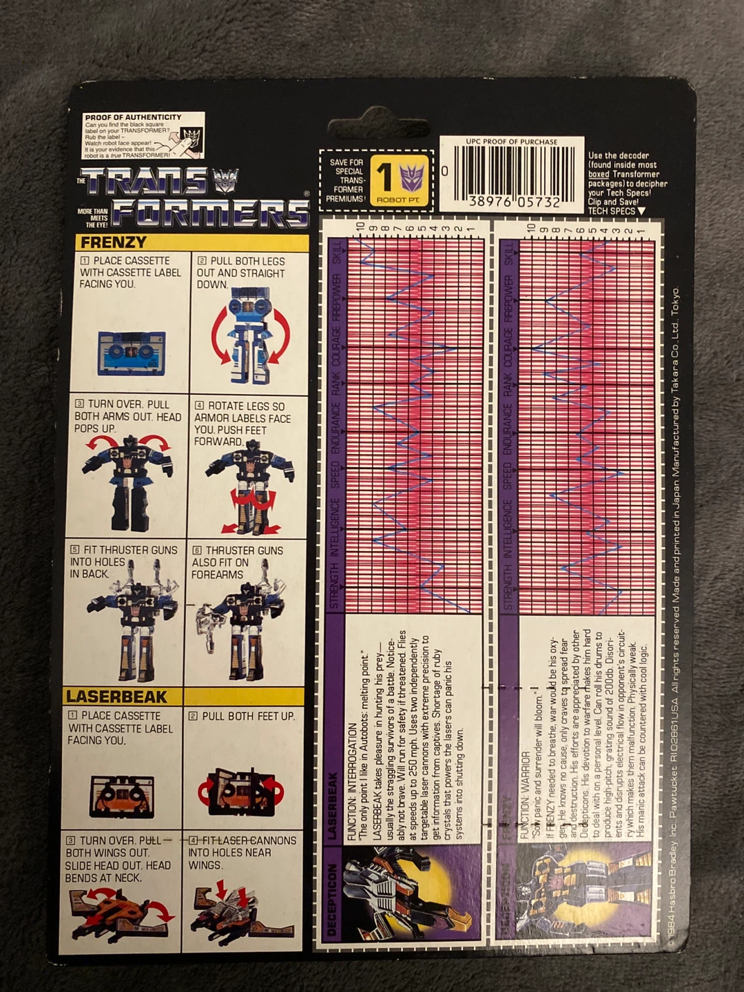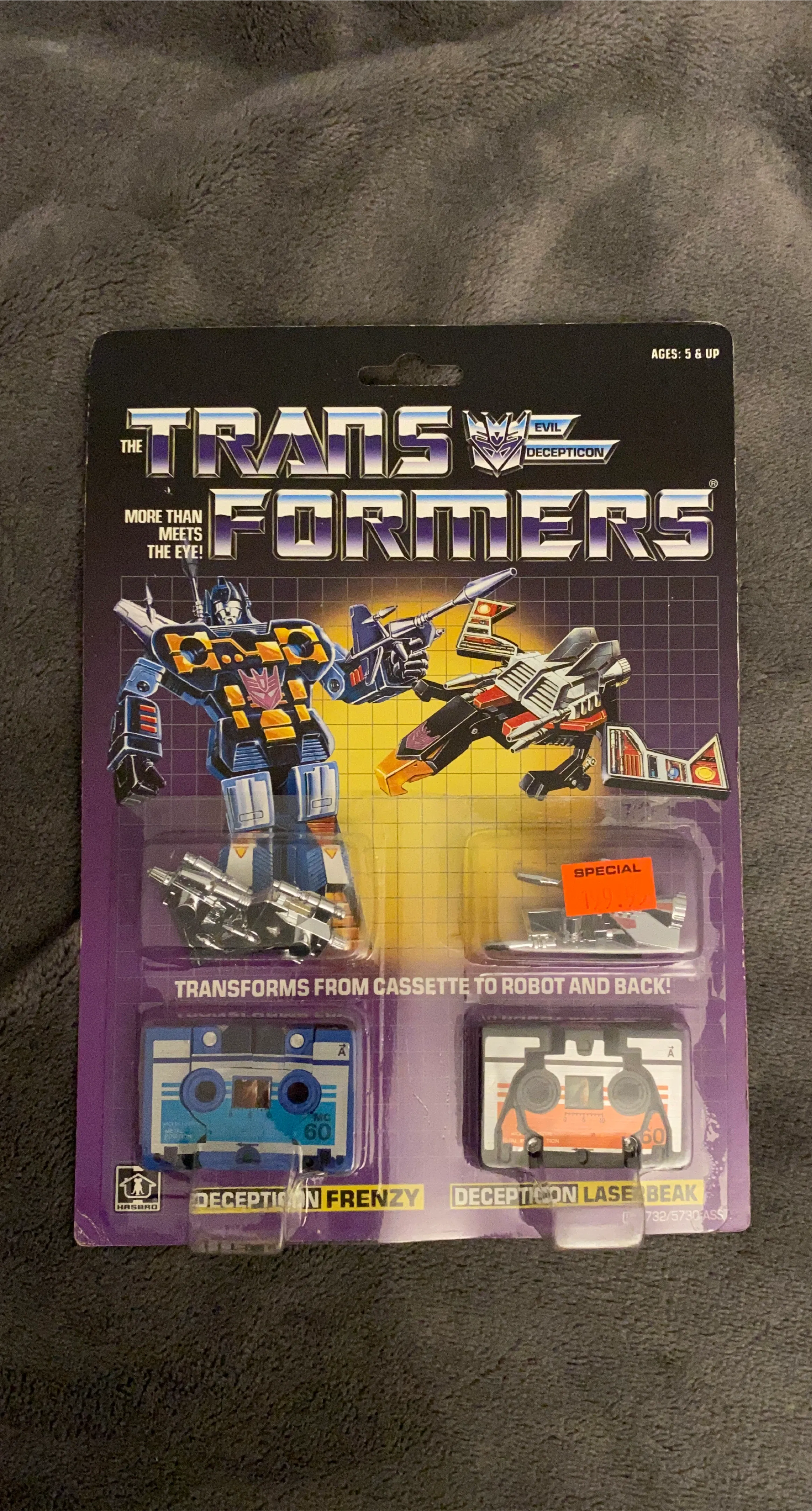 Selling a vintage 1984 Transformers action figure set featuring Decepticon Frenzy and Laserbeak! This set transforms from cassette to robot and back, a classic from the original series. A great addition to any Transformers collection!