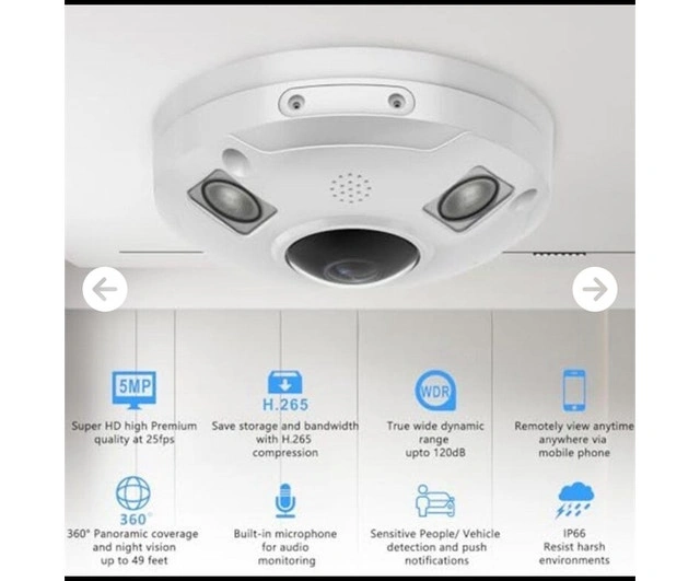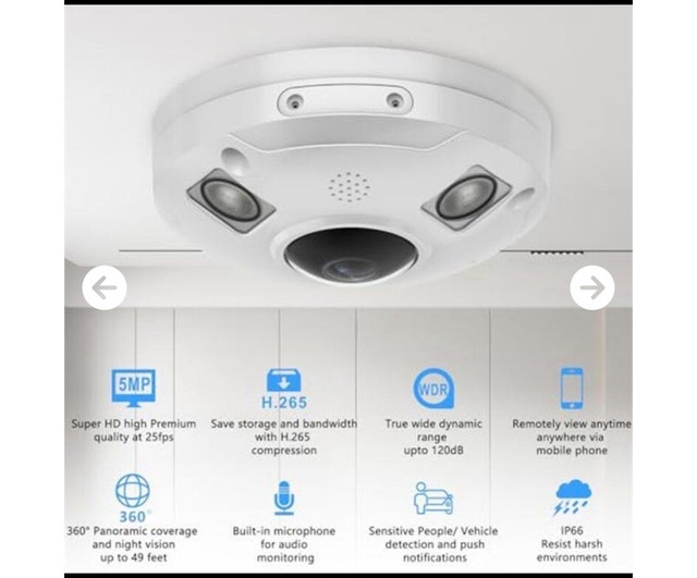 I'm offering a Vonnision 5MP POE IP Fisheye Camera with a 1.44mm lens, perfect for comprehensive surveillance. This camera provides a 360° panoramic view, ensuring no corner is left unmonitored, and features a built-in microphone for audio recording. It's never been used, is in perfect working condition and is ready to enhance your security setup. Key features include: