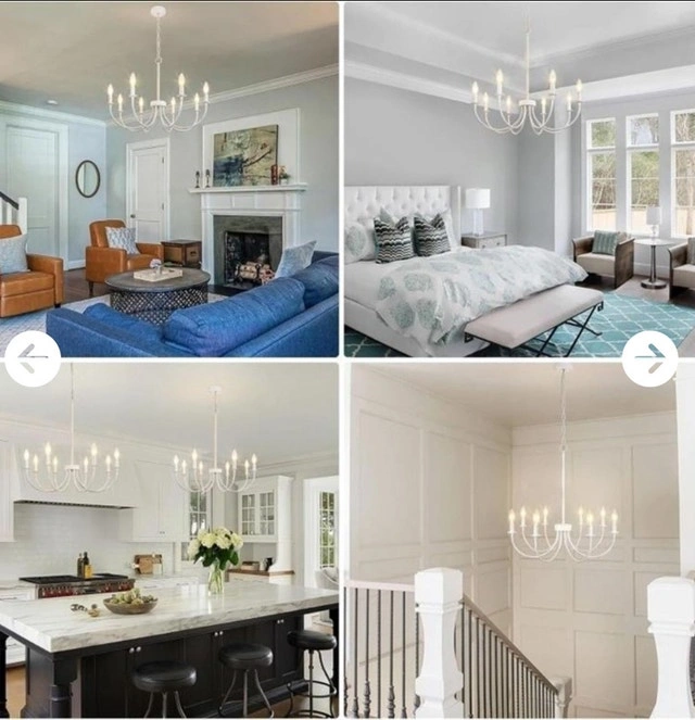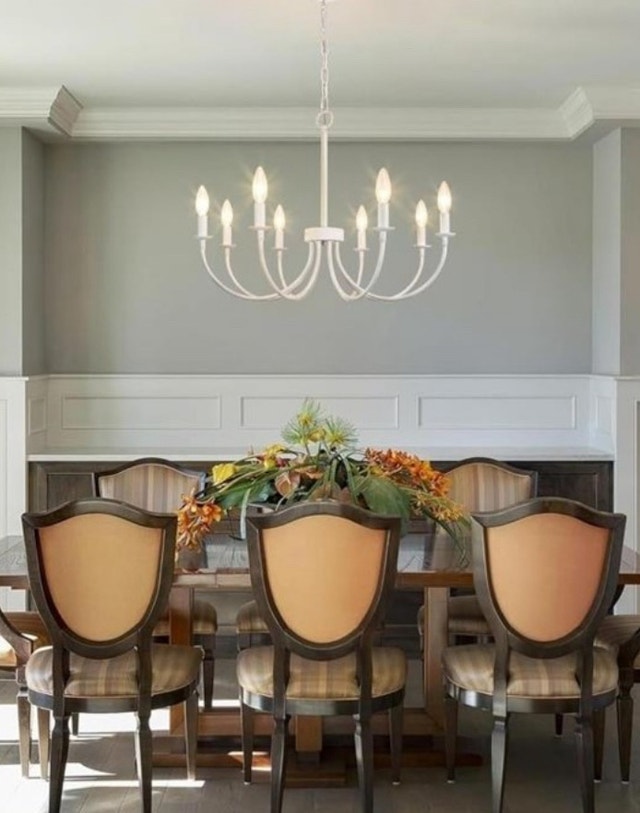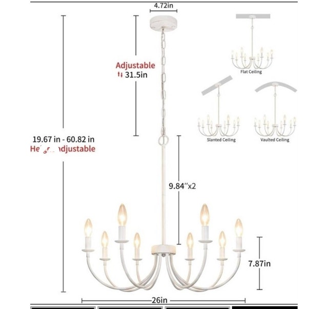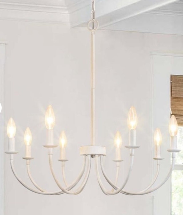 Elevate your dining room or living space with this elegant 8-light chandelier, finished in a sophisticated white metal with a subtle rust effect for added character. This chandelier is new in box, has never been used and ready to shine wherever it is installed. Here are its features: * Crafted from iron with a white metal finish * Features 8 candle stems on curved arms * Anti-oxidant, non-fading, and easy to clean * Adjustable height This chandelier is ready to light up your life—literally! And just so you know, if the ad's still up, it's still available!