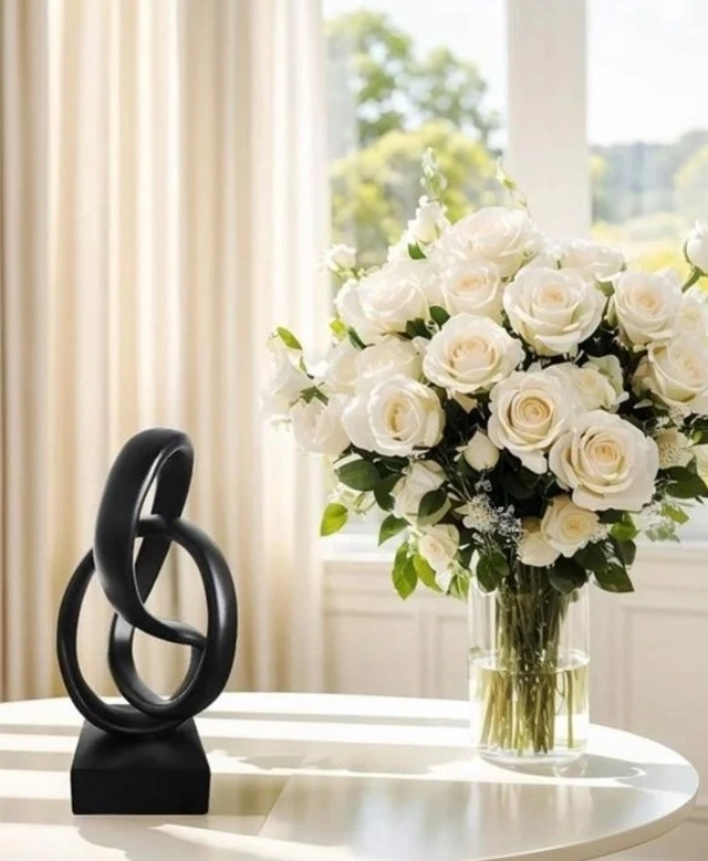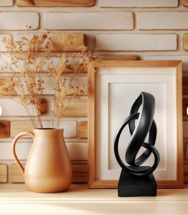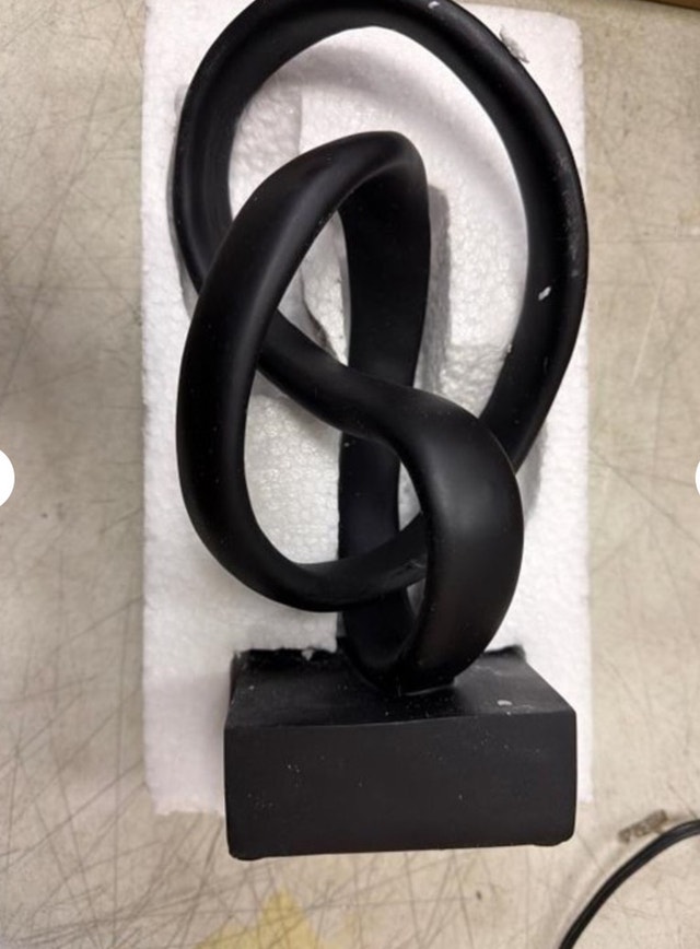 Add a touch of modern elegance to your home with this striking black abstract sculpture. This piece is a new in box decorative object that is sure to catch the eye and spark conversation. Its sleek design and matte finish make it a versatile addition to any room, blending seamlessly with various decor styles. Check my other listings as I have lighting that matches this piece perfectly and can make deal if all together. If the ad is up, it's available, so feel free to reach out!