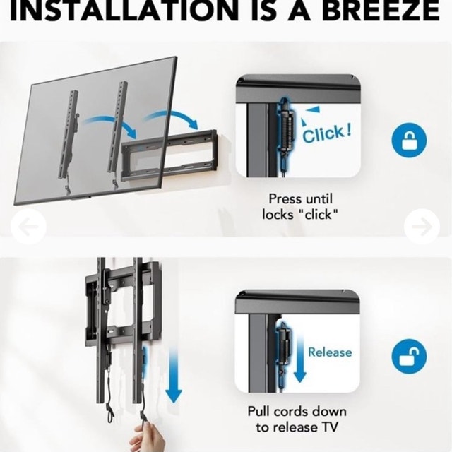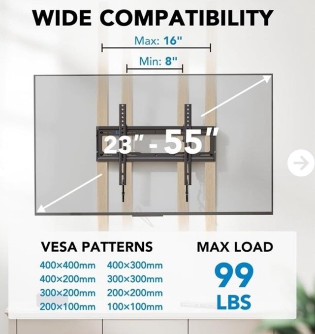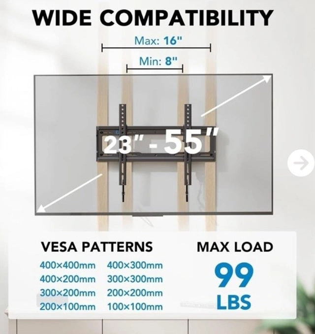 This TV wall mount is designed to securely hold your television, offering a sleek and space-saving solution for your home entertainment setup. It fits TVs ranging from 23 to 55 inches and supports a weight capacity of up to 99 lbs. This mount is new. Specifications: * Compatibility: Fits 23-55 inch TVs * Max Load: 99 lbs * VESA Patterns: Supports various VESA patterns (400x400mm, 400x300mm, etc.) * Easy Installation: Includes a built-in level and quick-release cords for easy setup. Get ready to enjoy your favourite shows with a streamlined look.