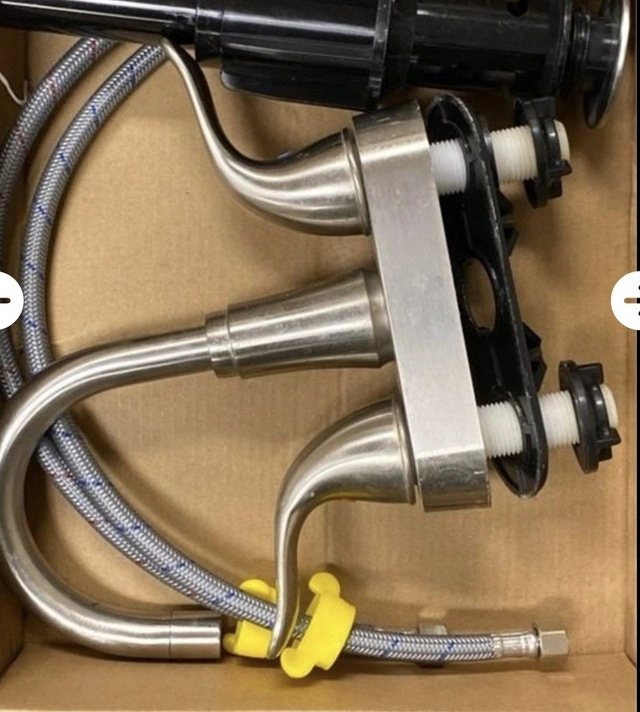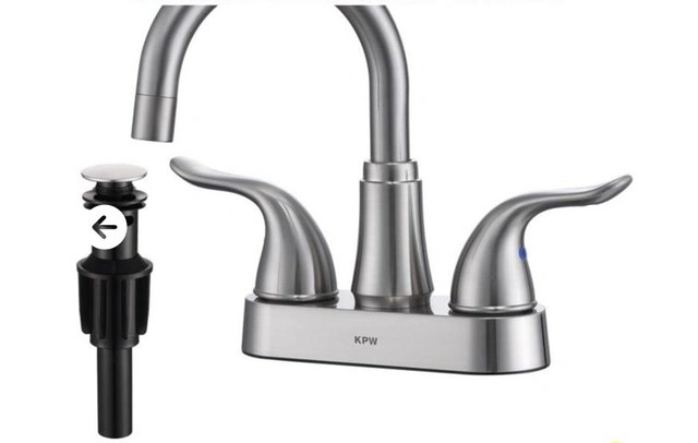 I'm selling a KPW faucet with a brushed nickel finish, perfect for any bathroom or kitchen sink. This faucet features a modern design with dual handles for easy temperature and water flow control. It has been lightly used and is in very good condition, showing minimal signs of wear.