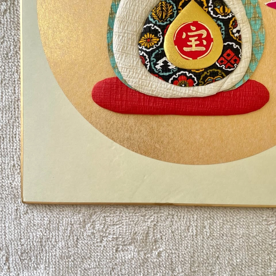 A traditional Japanese “oshie” (押絵) textile/paper art, made by layering and lightly padding small pieces of “washi” paper for a soft 3D effect.