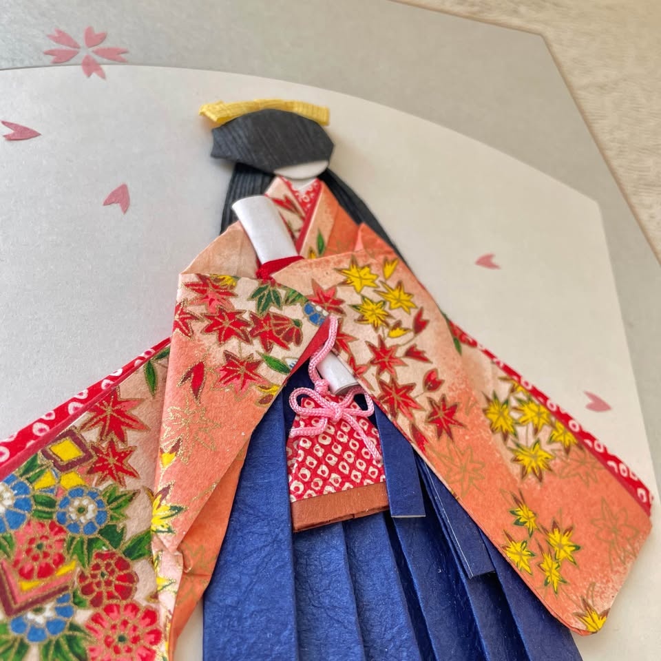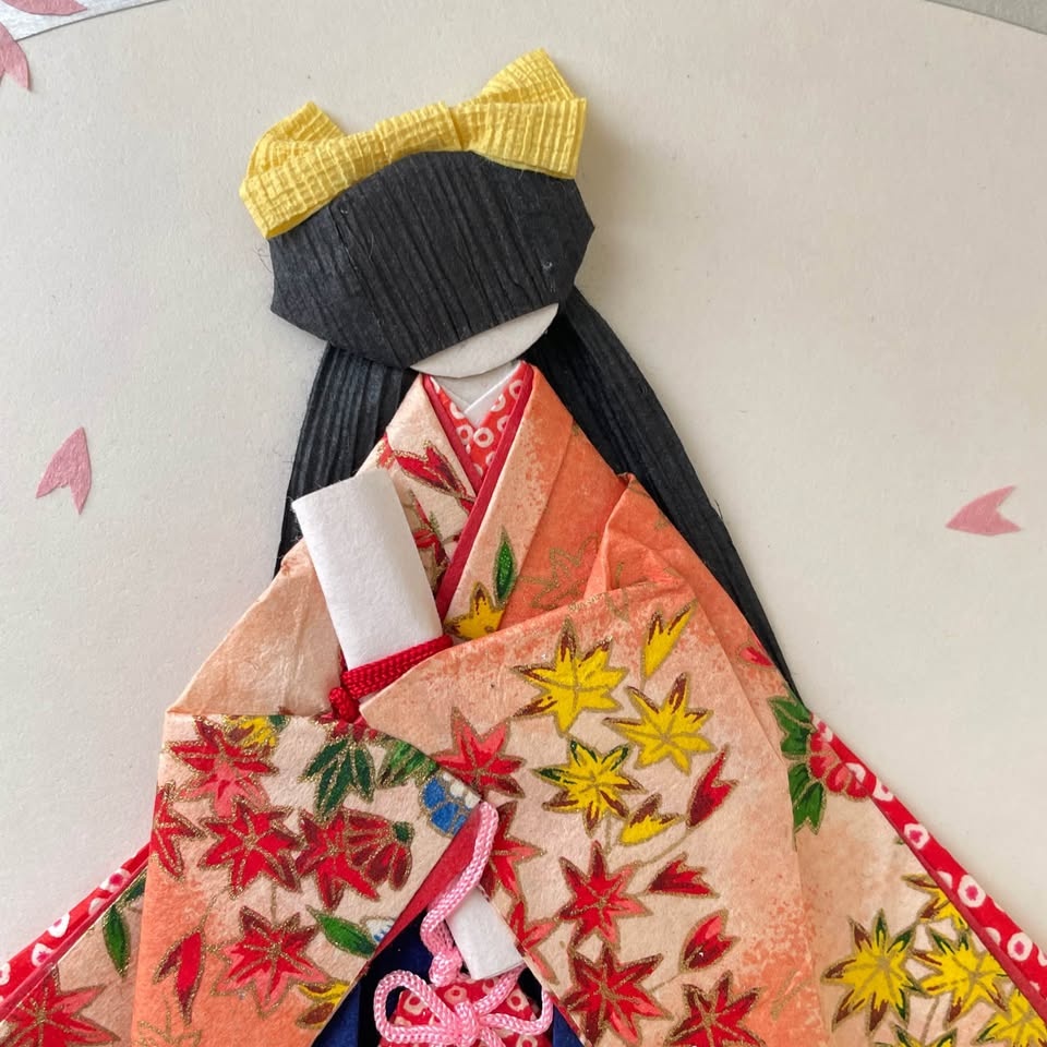Her flowing kimono sleeves, pleated hakama skirt, and a large fluffy bow are all created with intricate origami folding techniques, layered carefully for a 3D effect.
