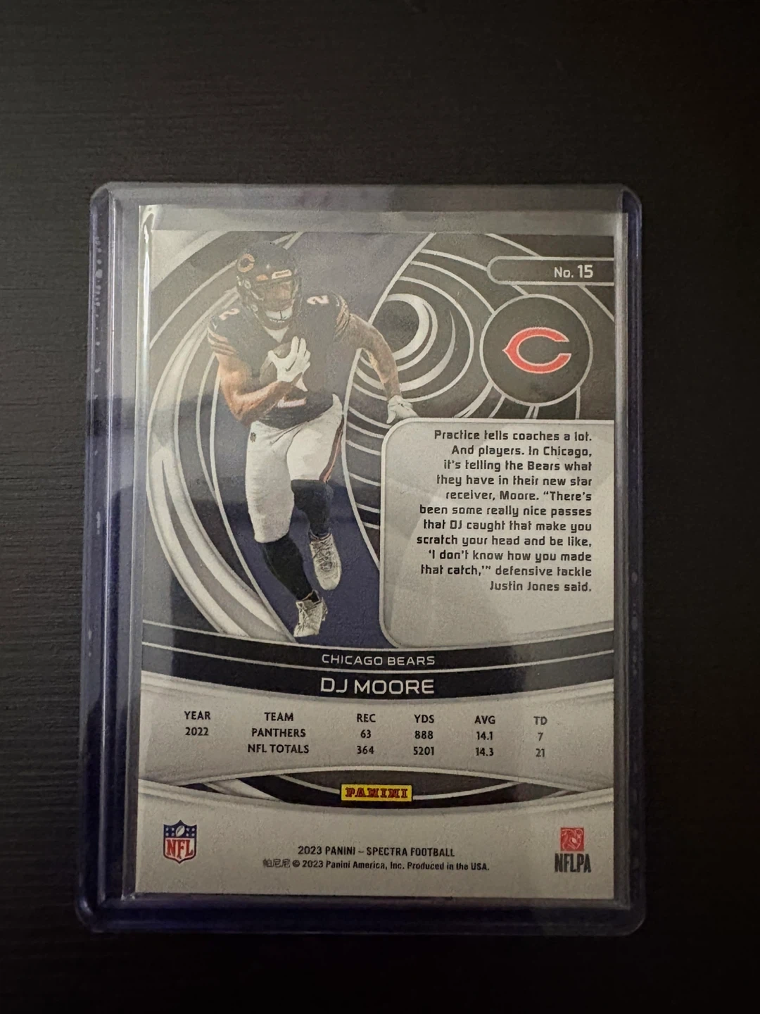 Selling a DJ Moore Chicago Bears football card. It's a 2023 Panini Spectra Football card. The card features DJ Moore in his Bears uniform. It also includes his stats from 2022, such as his receiving yards and touchdowns