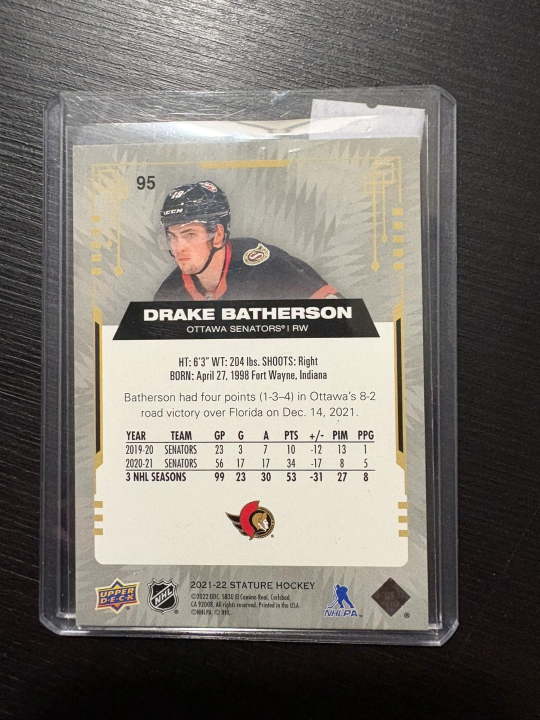 Selling a Drake Batherson Upper Deck Stature hockey card. The card is from the Ottawa Senators and is in great condition. It's a 2021-22 Stature Hockey card from Upper Deck