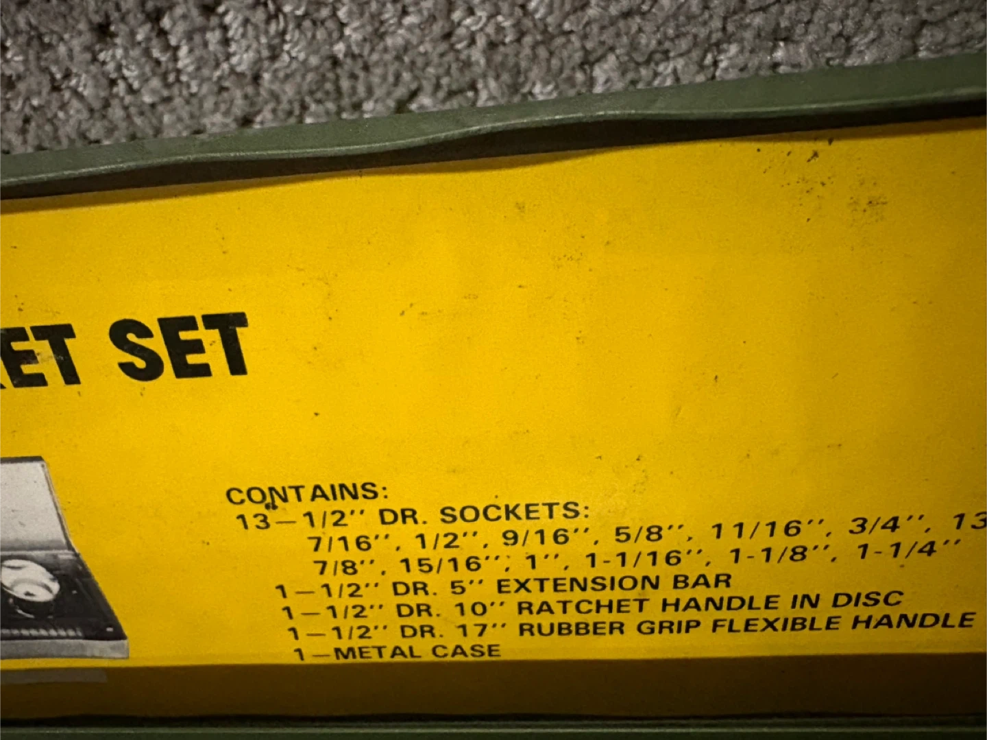 Selling a Pit Bull 16 pc. piece 1/2" drive socket set. The set includes sockets, an extension bar, a ratchet handle, and a flexible handle. This is missing the 7/16 socket.