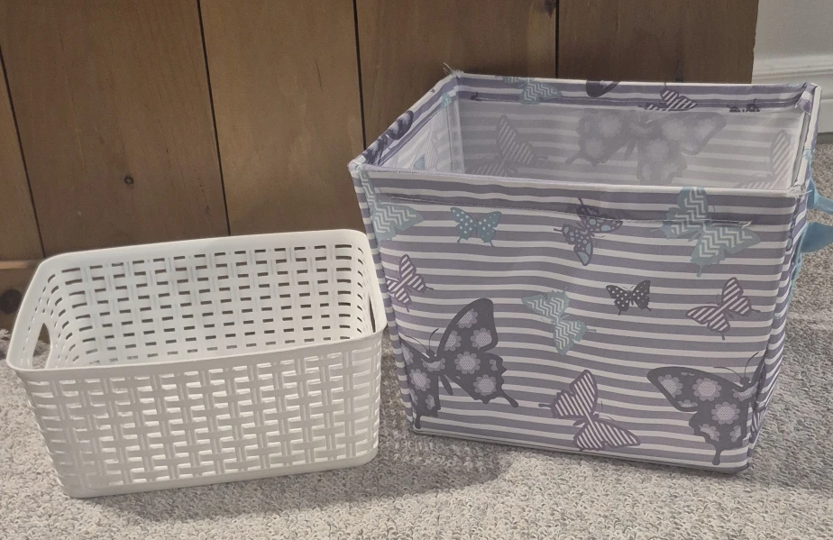 Selling two storage baskets! One is a white plastic basket. The other is a fabric basket with a cute butterfly pattern on purple and white stripes
