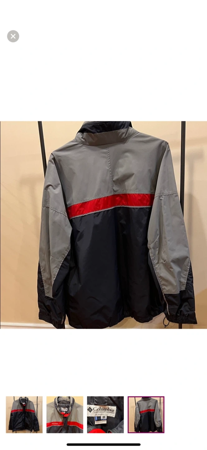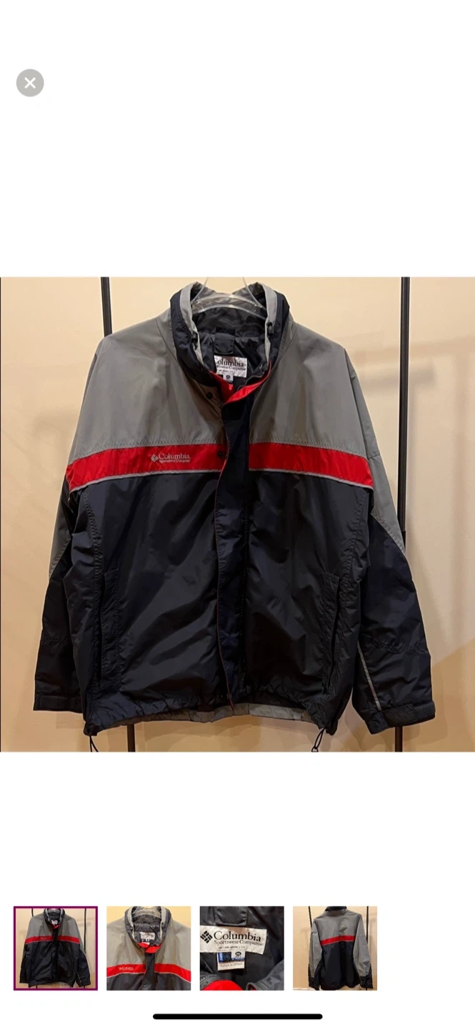 Columbia jacket in a combination of grey, red, and navy. It's in great condition and ready for a new owner!