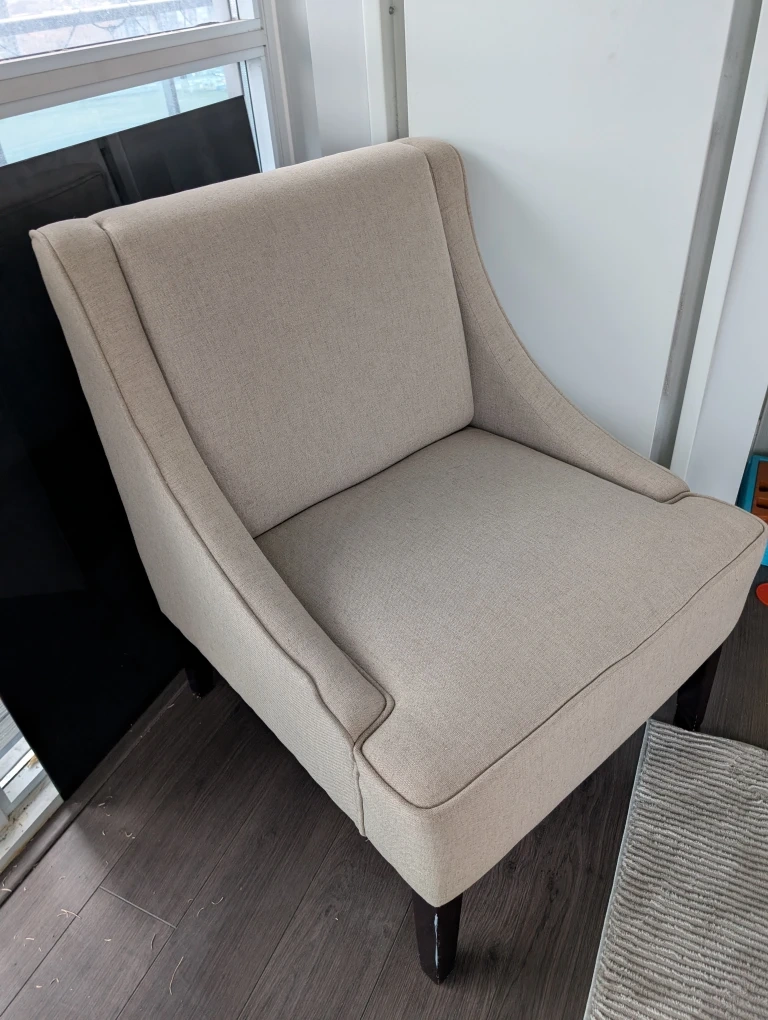 Selling a beige accent chair in perfect condition. It's a stylish and comfortable addition to any room. The neutral colour makes it easy to match with existing decor.