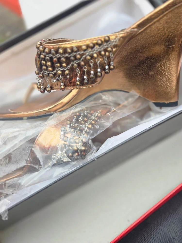 These bronze wedge sandals from Pierre Dumas are in great condition and come with their original box! They feature a beaded embellishment and are a size 7. Perfect for adding a touch of sparkle to your outfit!