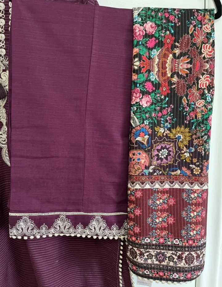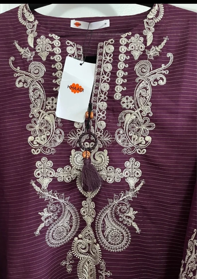 Selling a beautiful Khaadi 3-piece suit in a lovely plum colour with intricate embroidery. The set includes a shirt, pants, and a dupatta. Perfect for a special occasion or everyday wear!