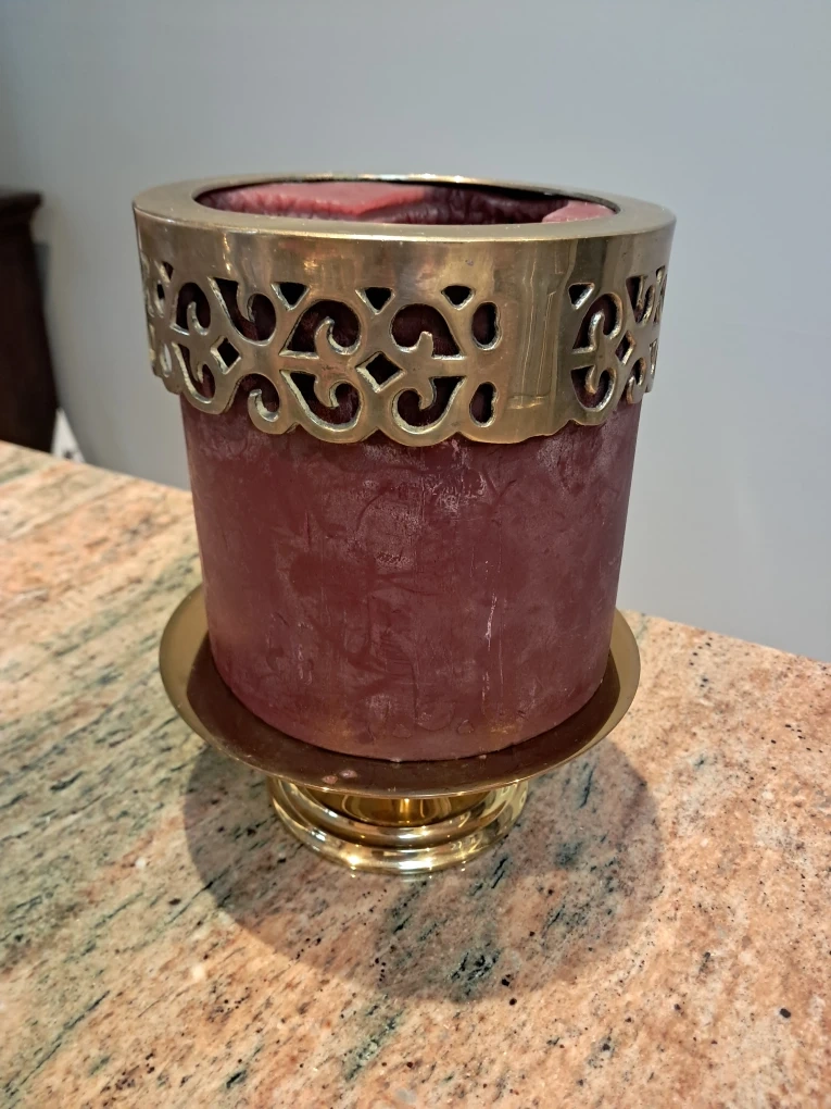 Selling a Partylite brass candle holder and glass hurricane. Three wick candle with brass ring. Brass cradle for hurricane lamp. They are all in good condition and would look great in any home! One price for all,