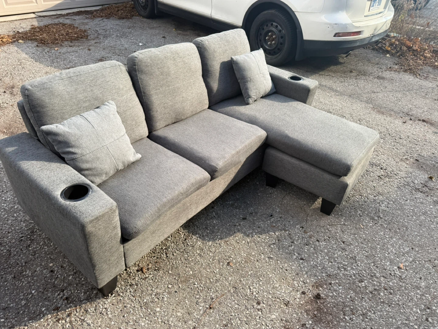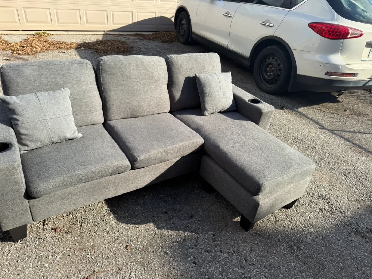 Selling a comfy grey sectional sofa that features a chaise lounge for extra relaxation! It's in good condition and would be a great addition to any living room. It also comes with a couple of throw pillows and convenient cup holders on the armrests