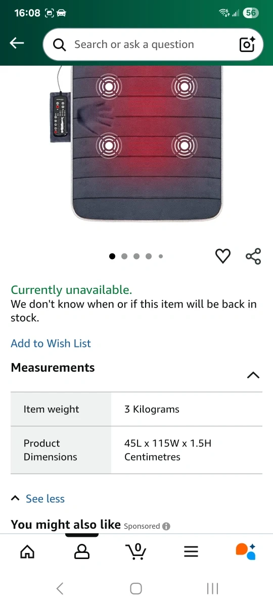 I'm selling a Snailax memory foam massage mat with heat. It features 10 vibration motors to massage your neck, back, waist, legs, and more! It's a full body massager cushion. It is 45L x 115W x 1.5H Centimetres and weighs 3 Kilograms
