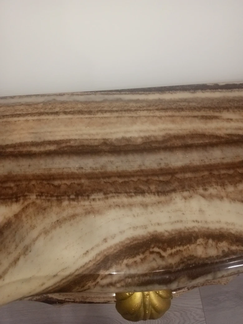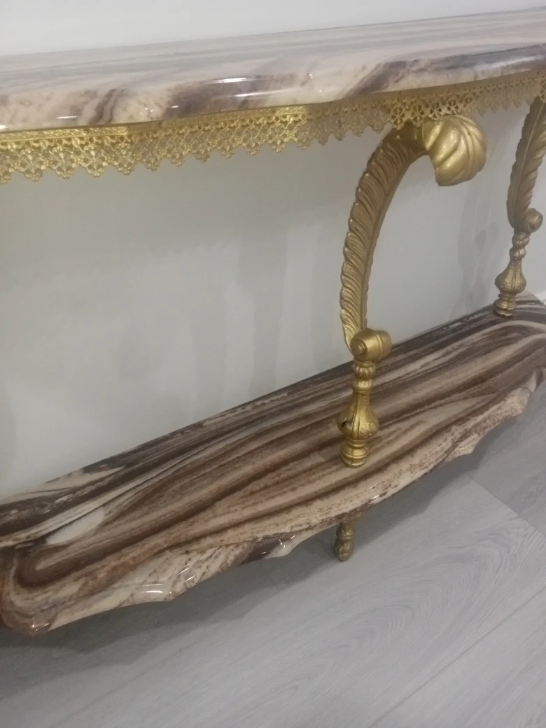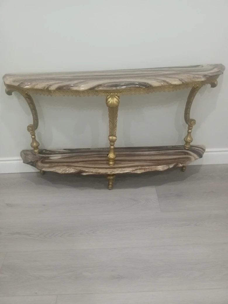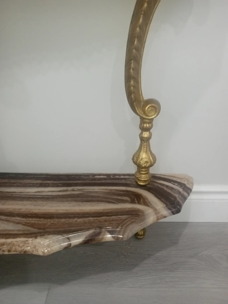 Selling a beautiful console table featuring a unique marble top with swirling brown and beige patterns. The ornate gold accents add a touch of elegance. It's a great piece to add some sophistication to your entryway or living room!