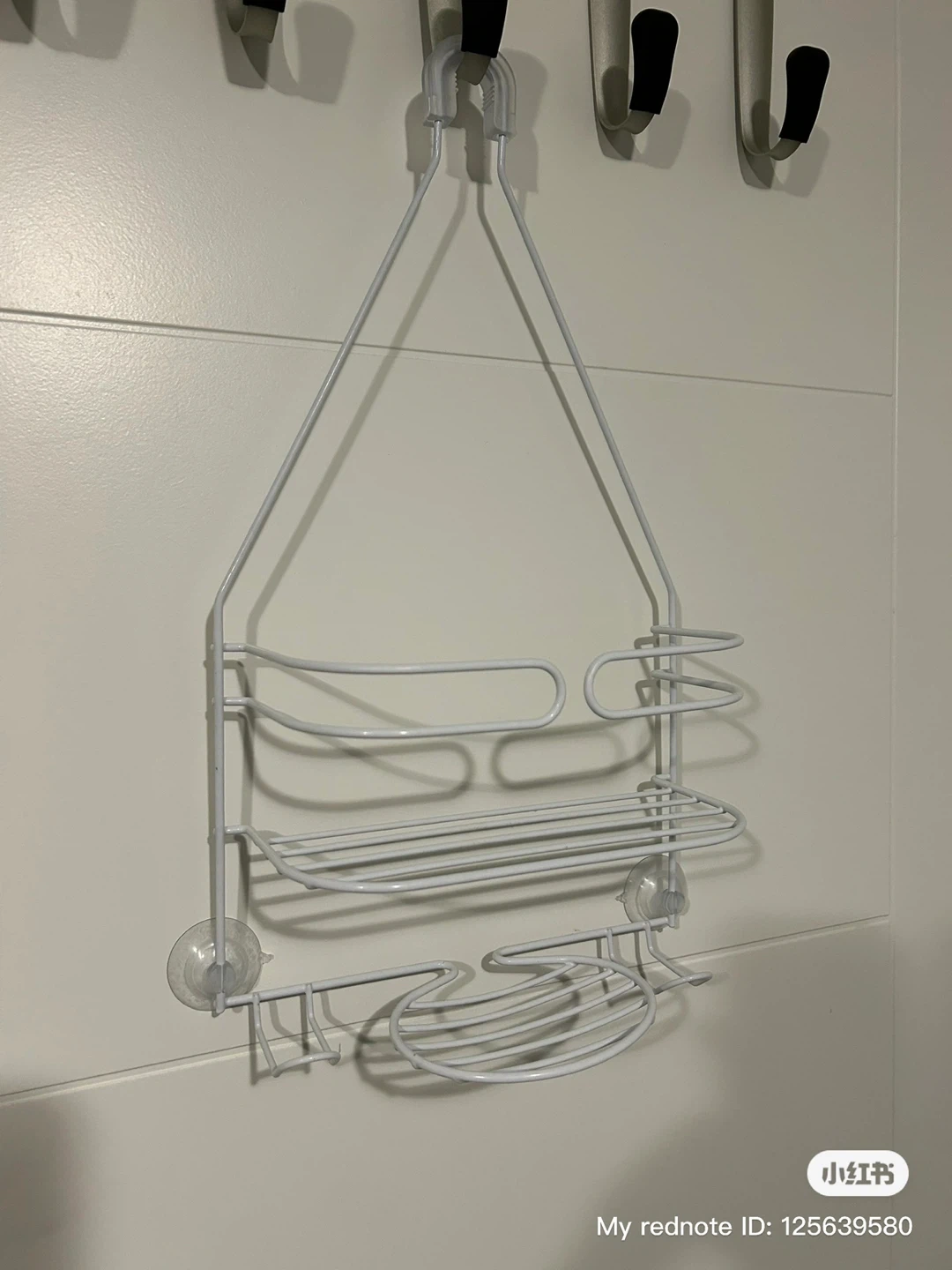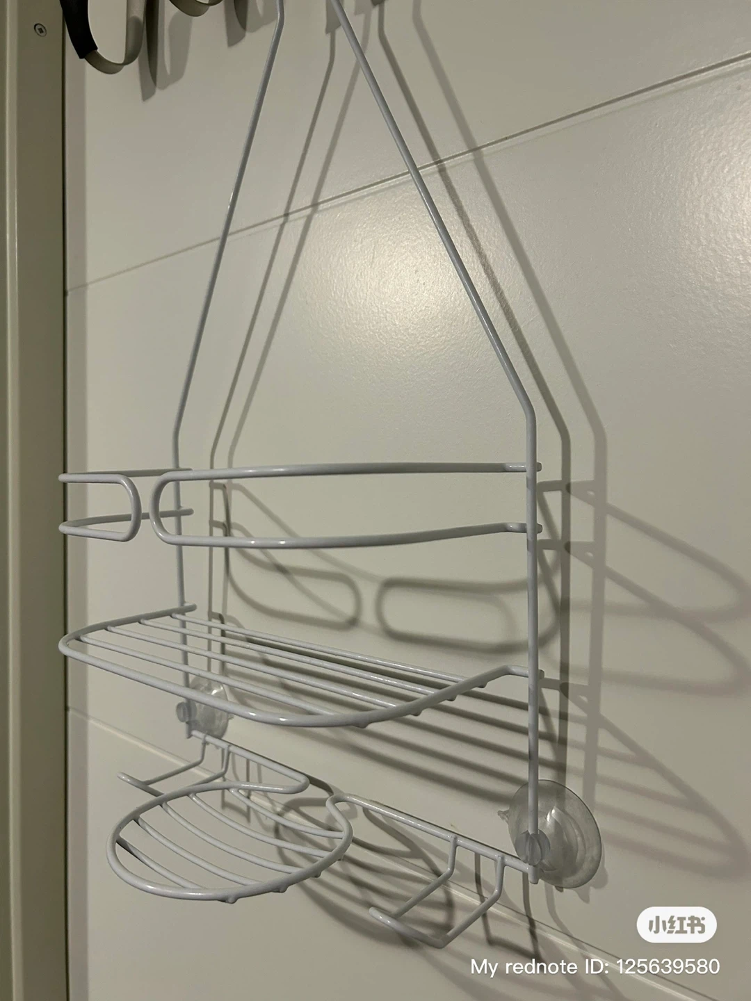 This is a handy over-the-shower-head caddy! It's in great shape and ready to organize your shower essentials. It has a simple design with multiple tiers for storage