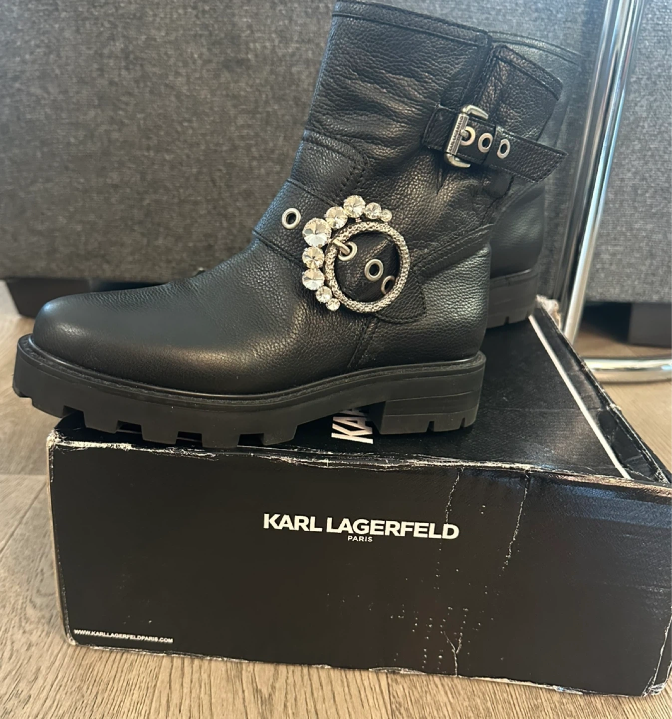 AUTHENTIC Karl Lagerfeld Paris Marceau combat boots in US size 8.5. They're black tumbled leather with a lug sole and crystal detailing. Comes with the original box!