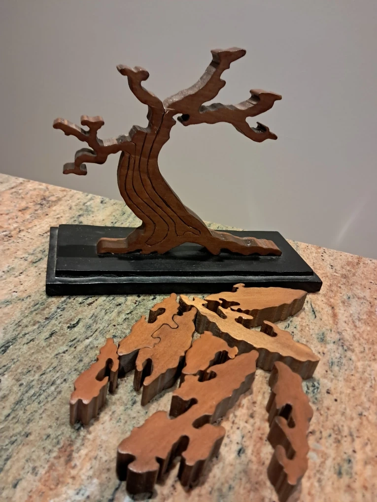 Selling a wooden bonsai tree puzzle. It's a unique and interesting piece! All the pieces are included, and it's in great condition. Would look great as a decorative item!
