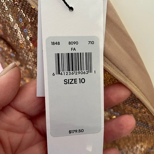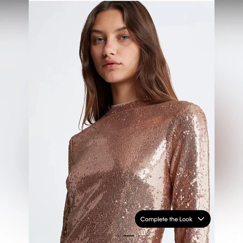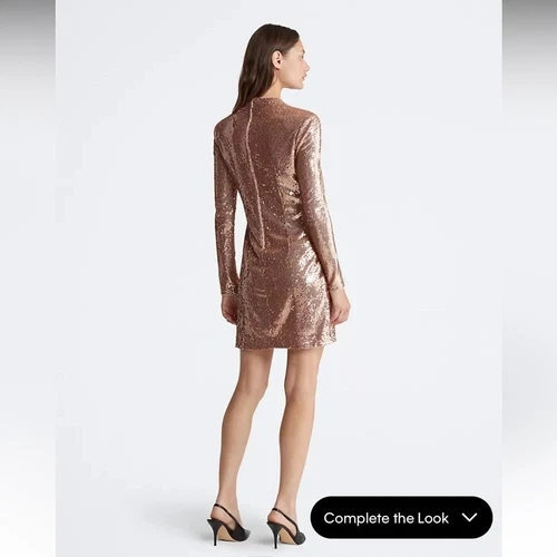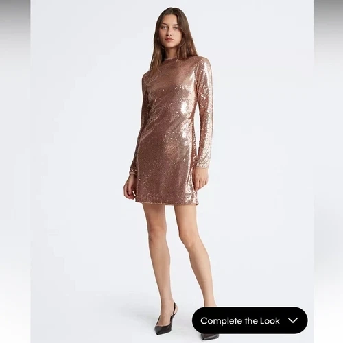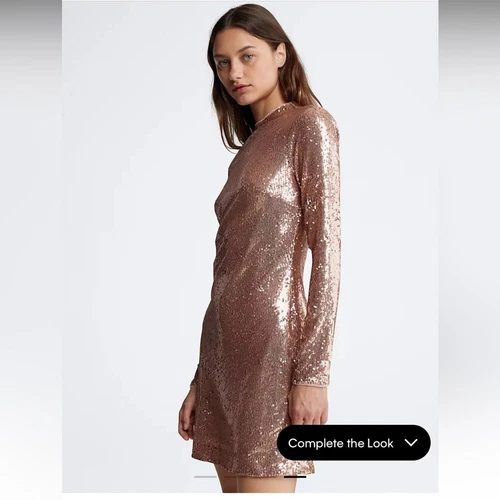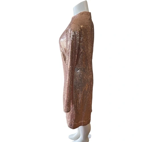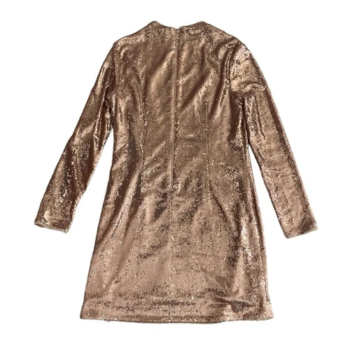 Brand new with original tags. Simply Stunning Gold Formal dress / Cocktail dress with Sequins. Embellished with sequins, this shimmering mini dress is both playful and chic. Created with long sleeves and a mock neck. Cut in a slim, fitted silhouette that accentuates your figure. Allover sequin design. Long sleeves + mock neck. Slim, fitted silhouette. Zip closure at the back. Mini length. Model is 5'9" wearing a size S. Material: Shell: 100% polyester. Lining: 100% polyester. Excellent condition comes from a pet free smoke free home.
