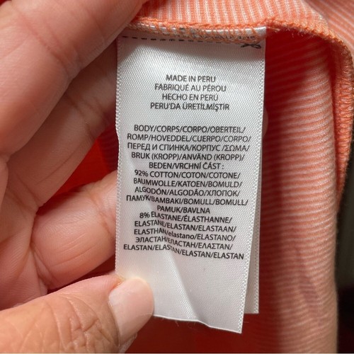 Elevate your style with this classic orange and white striped polo shirt. Perfect for any casual occasion.Brand new with tags.Spread collarFour-button placketShort sleeves"Polo" loop at the right cuffMaterial: 92% Cotton and 8% ElastaneMade in PeruExcellent condition comes from a pet free smoke free home