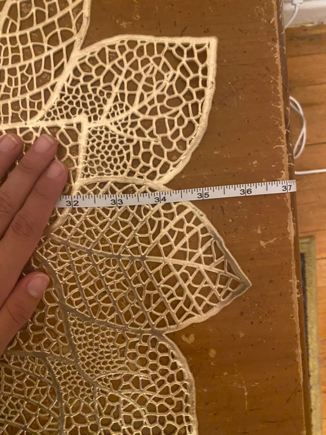 Selling a gold floral table runner. It is make of plastic and measures approximately 36 inches in length. With a little flattening it is perfect for adding a touch of elegance to your dining table or holiday decor.