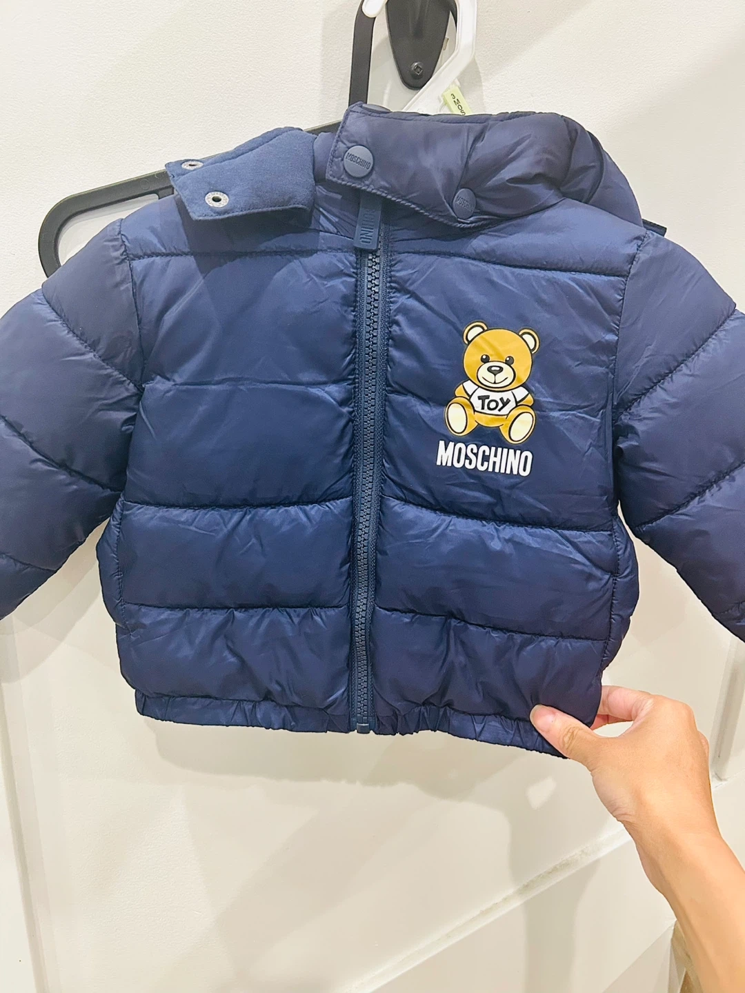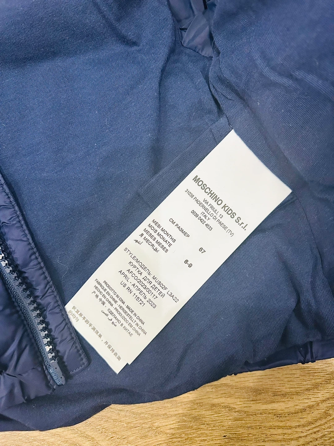 Here's a cute Moschino Baby puffer jacket in a lovely navy blue colour! It's sized for 6-9 months. Features the iconic Moschino teddy bear design. Perfect for keeping your little one warm and stylish!