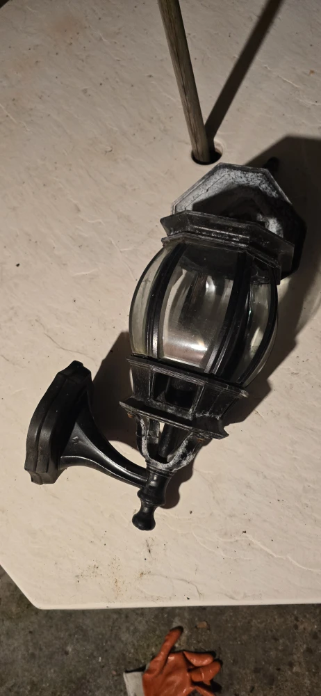 Selling a charming outdoor wall lantern in black. It has a classic design that would look great on any porch or patio. There are some signs of wear, but it's still in good working condition!