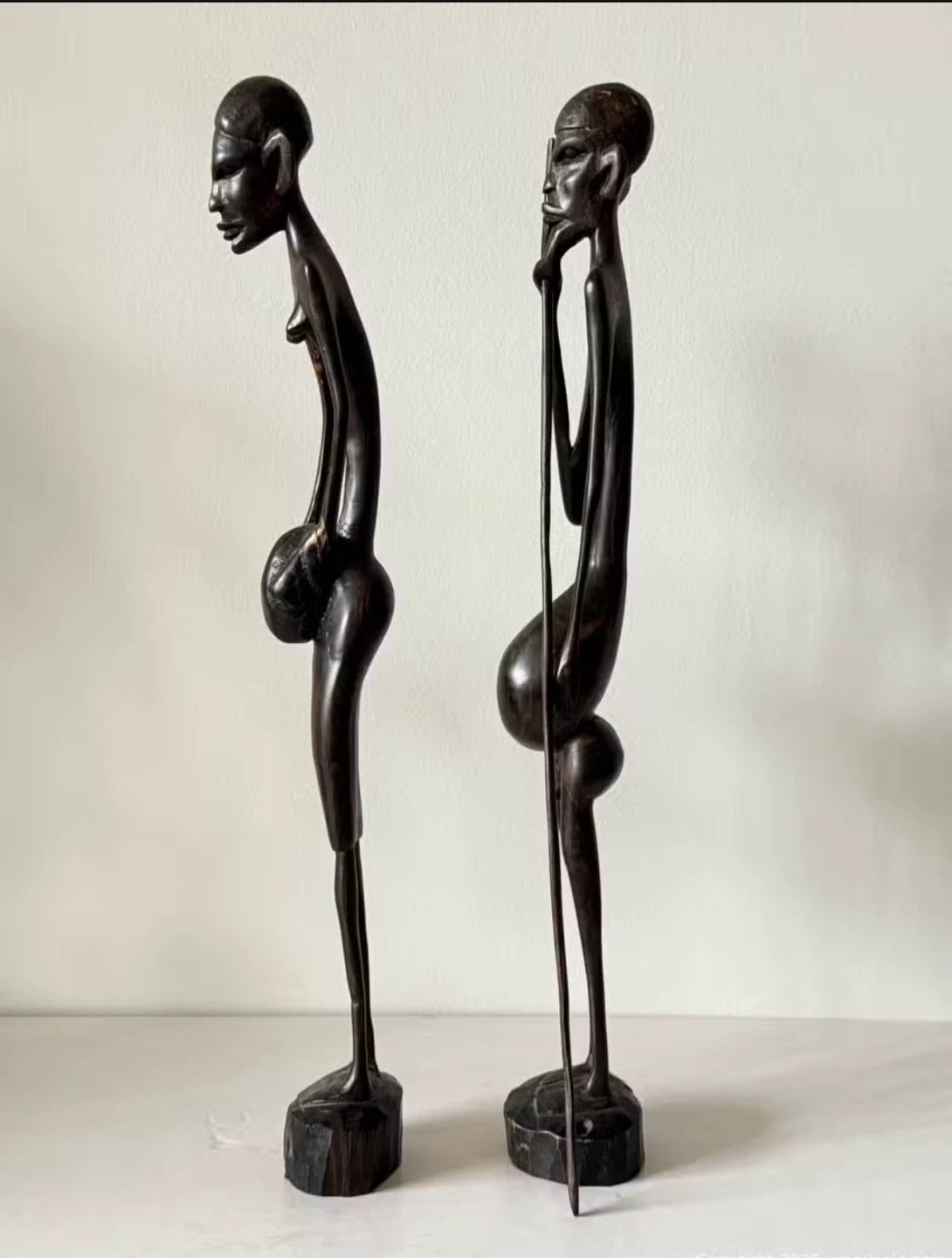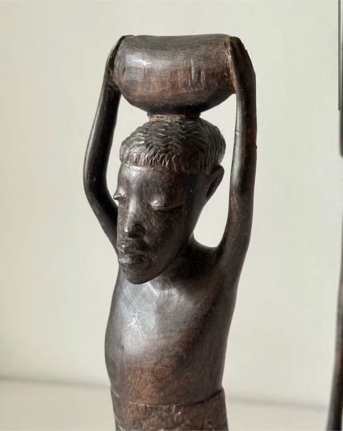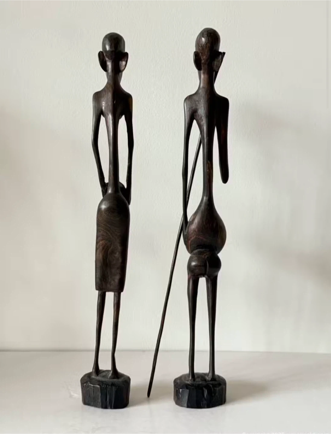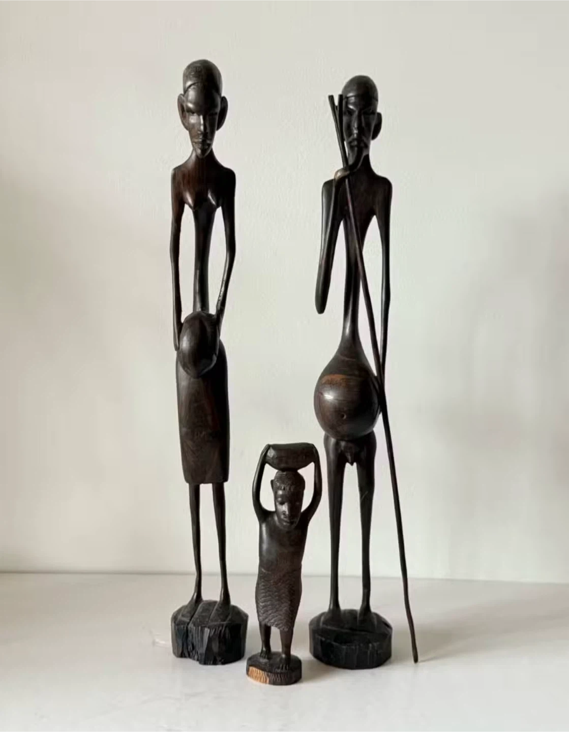 Selling a set of three unique wooden African figurines. These hand-carved pieces would make a great addition to any home decor. They have a beautiful, rustic charm and are in great condition!