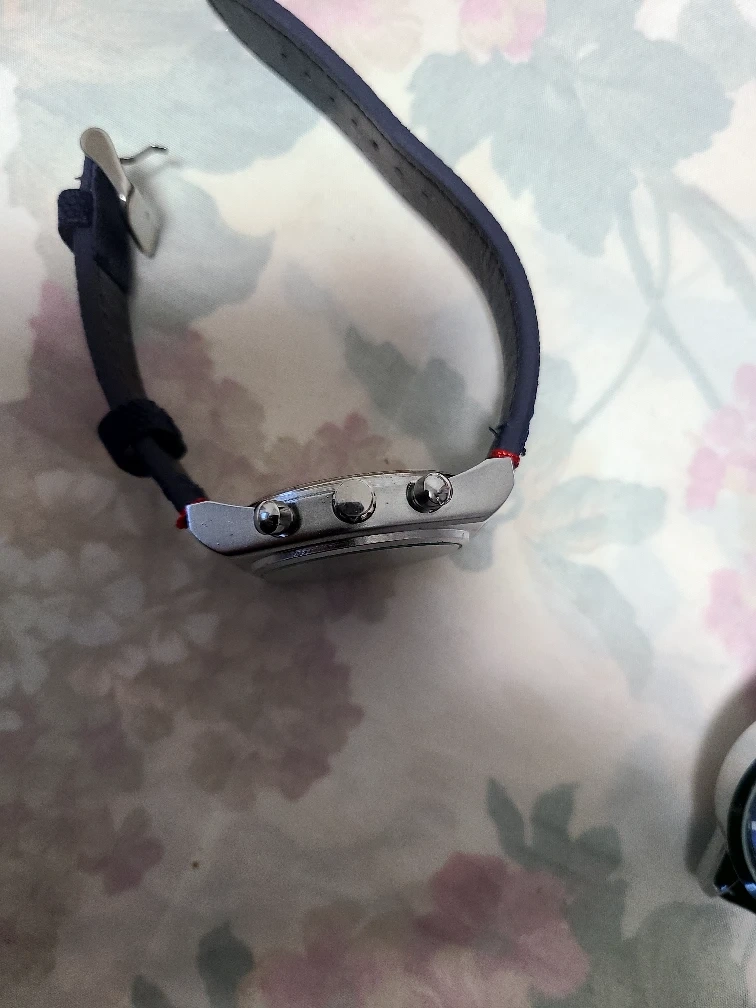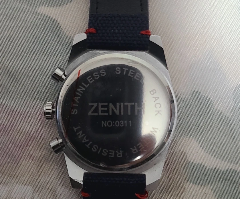 Selling a Zenith watch with a stainless steel back. The watch has a blue face with white subdials and a canvas strap. It shows some signs of wear but is still in good condition!