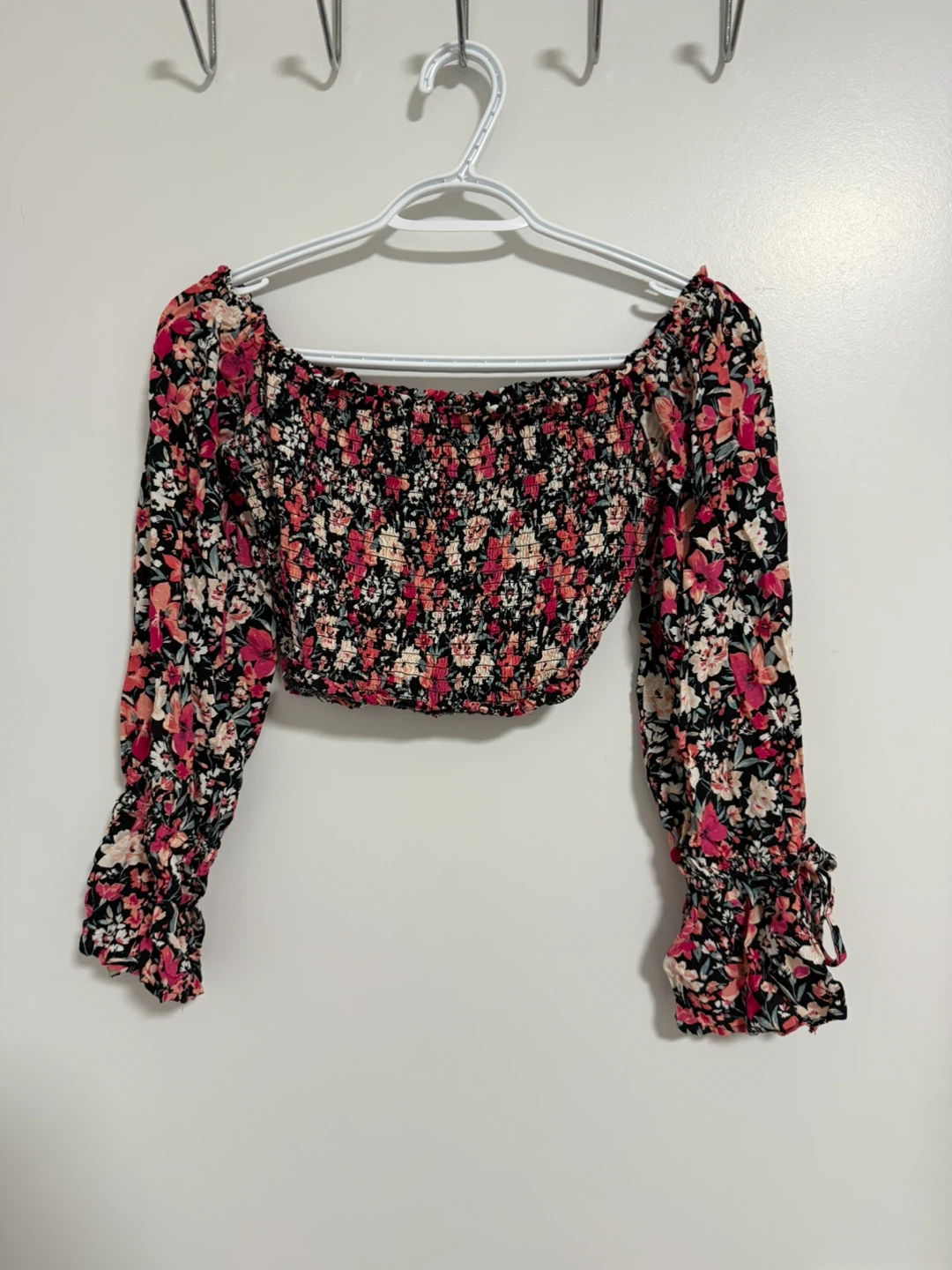 Cute floral long sleeve crop top! Perfect for spring or summer. The top has a smocked bodice and ruffled sleeves. Size small.