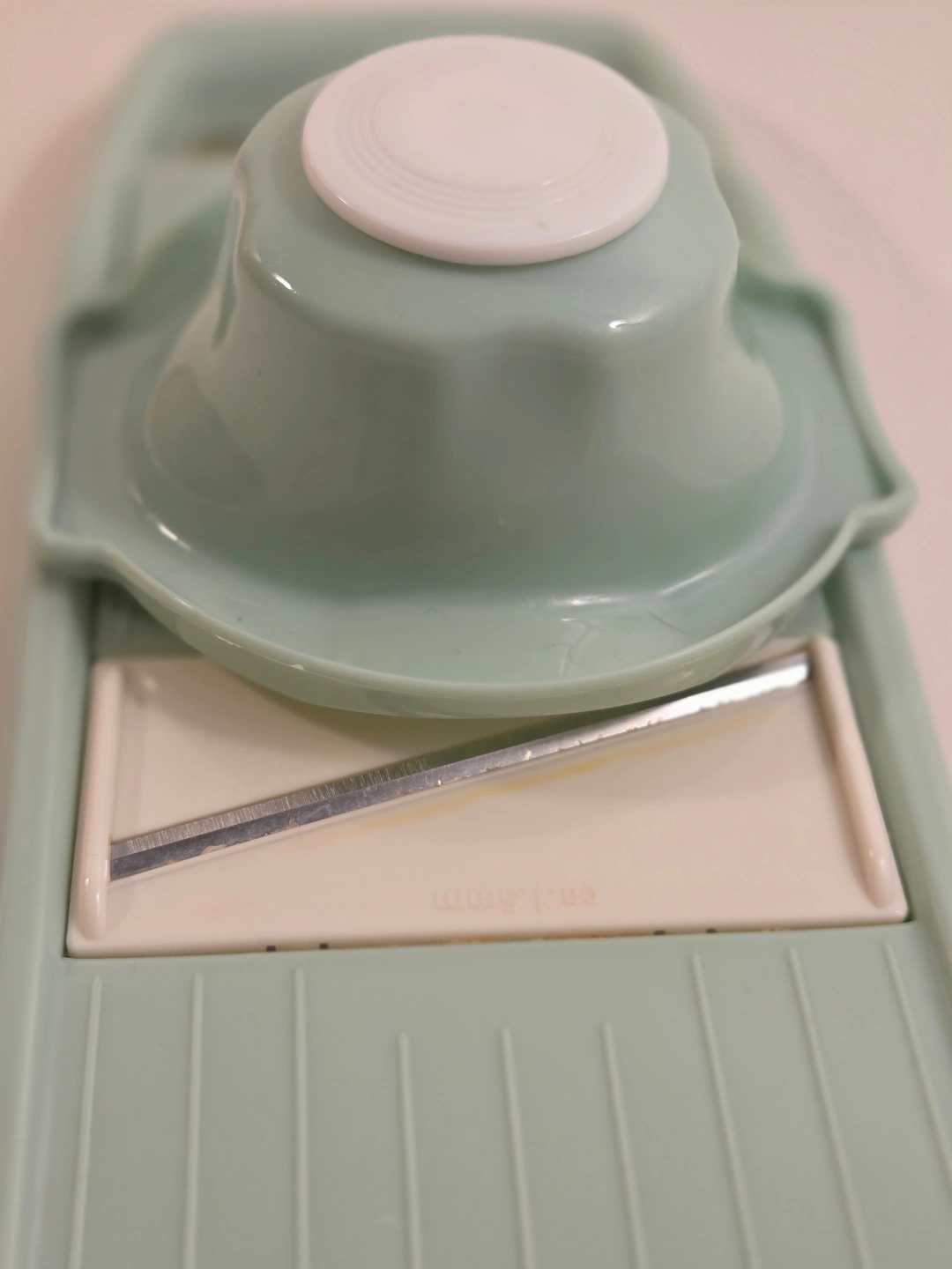 Clean, mint-green mandoline slicer with adjustable slice thickness (approx. 1–8 mm) and a safety hand guard. Set includes the main straight blade plus 4 inserts: two julienne combs (fine and coarse), a crinkle/wavy cutter, and a perforated grater-style plate – see photos. Great for salads, potato chips, coleslaw, stir-fries and veggie prep.