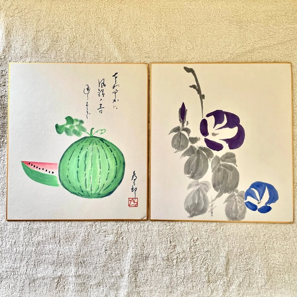 A lovely pair of hand-painted watercolor paintings on shikishi boards.