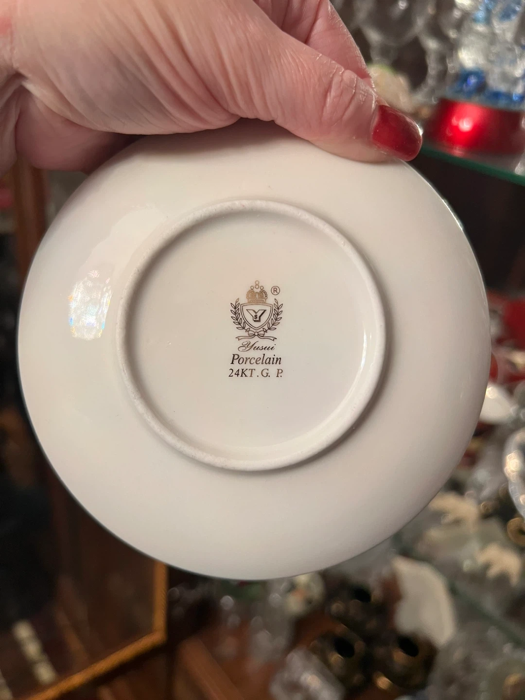 Selling a beautiful cup and saucer set from Yusuf Porcelain. The set is decorated with 24KT gold plating and features a classic design. Perfect for adding a touch of elegance to your tea time!