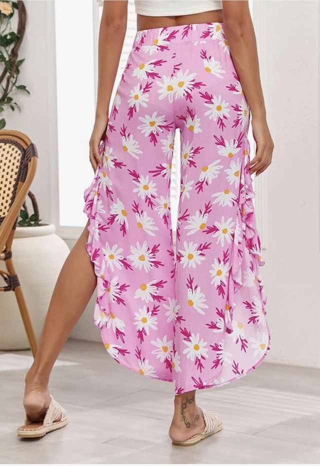 Elevate your wardrobe with these brand new Famulily pink floral print wide-leg pants, size large, featuring chic ruffle detailing and stylish side slits. These pants offer a blend of comfort and fashion, perfect for making a statement. Additional specifications include: