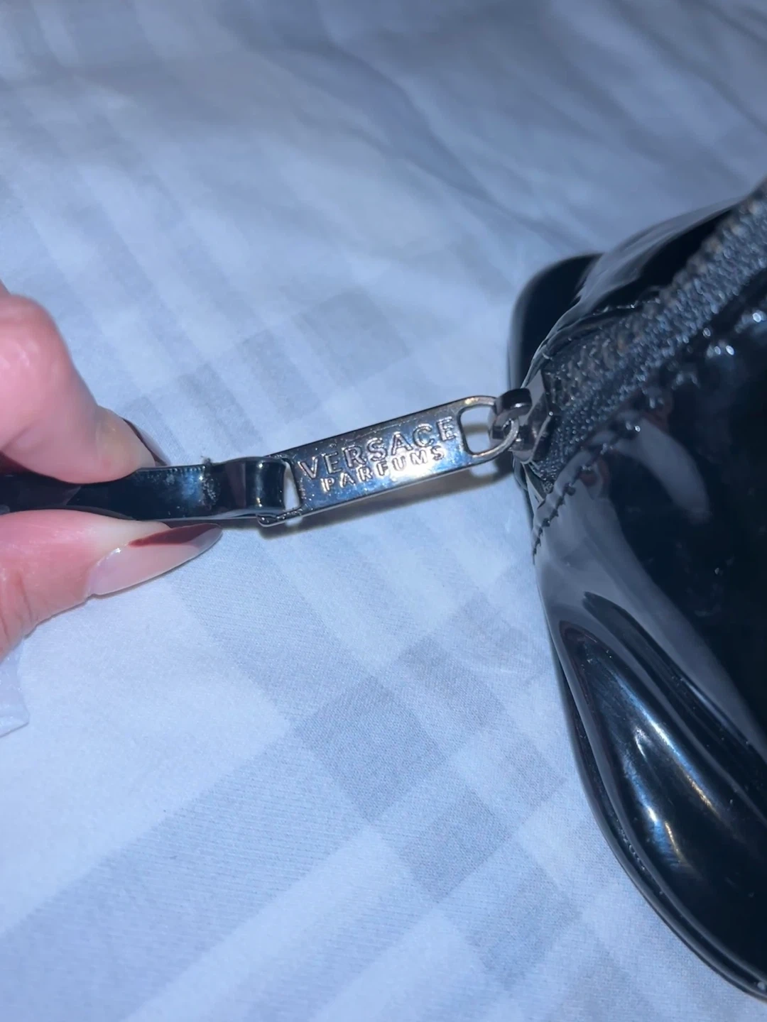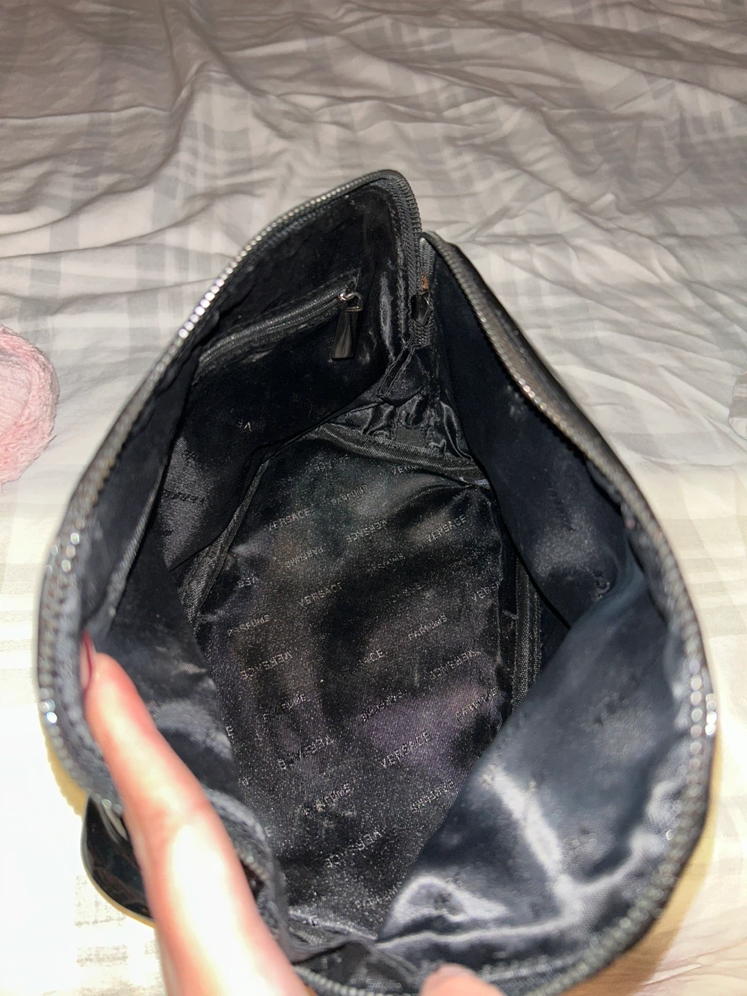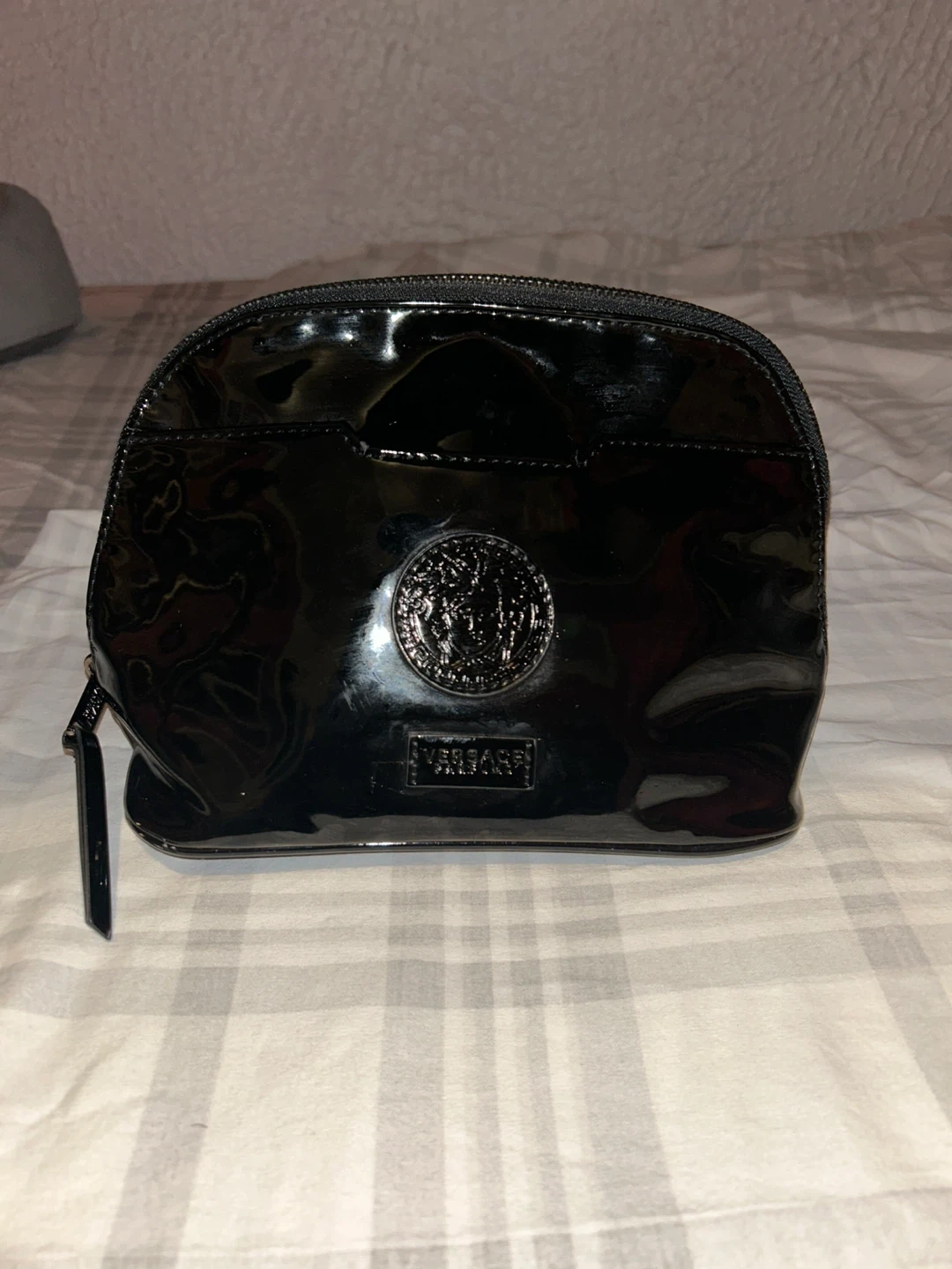 Selling a Versace cosmetic bag in black. It's in great condition and perfect for storing your makeup and skincare essentials. The bag features the Versace logo and has a zipper closure.