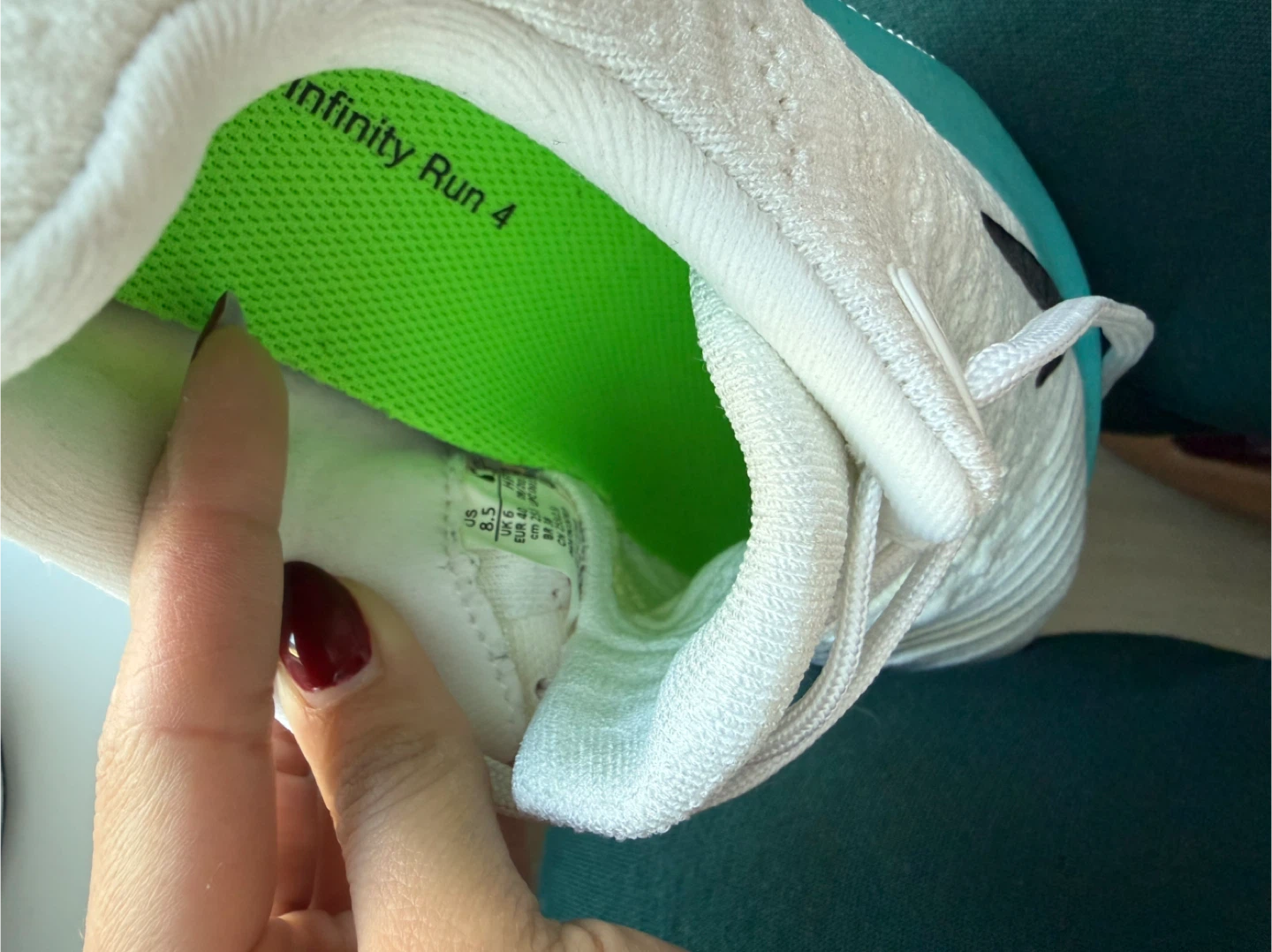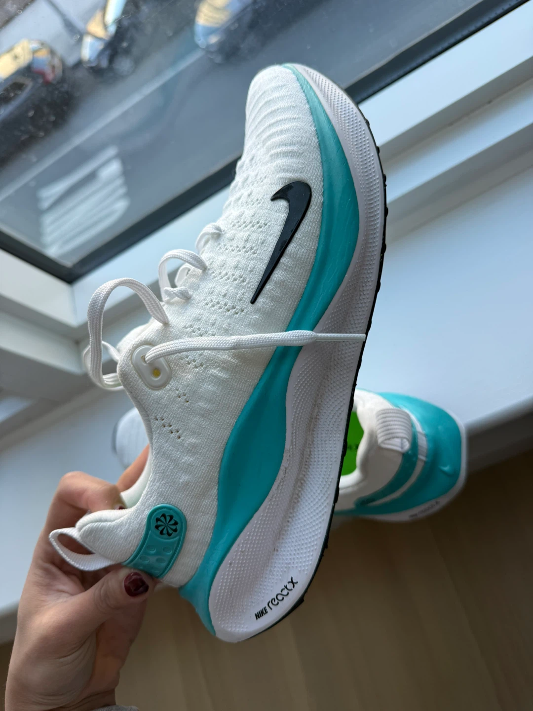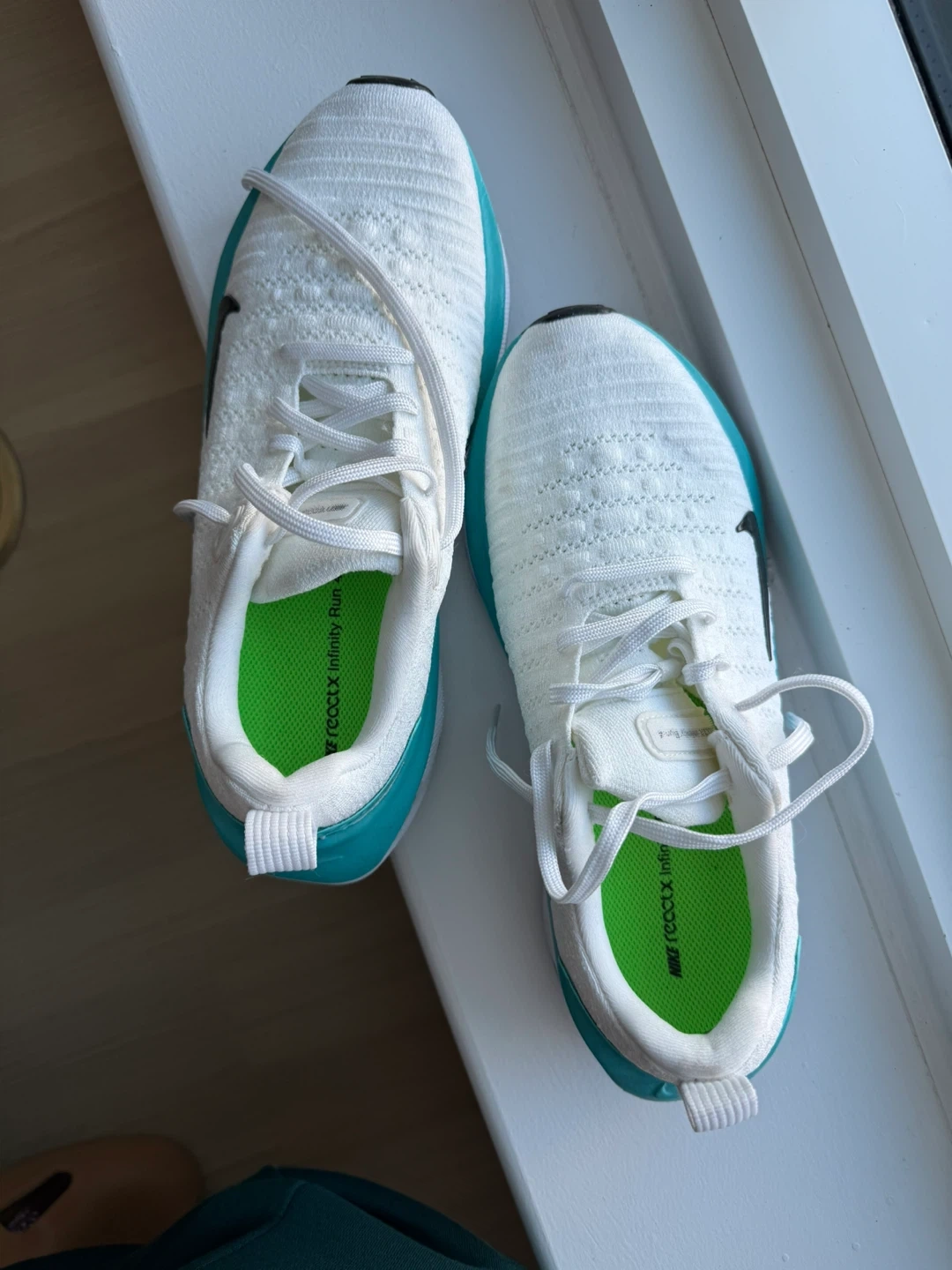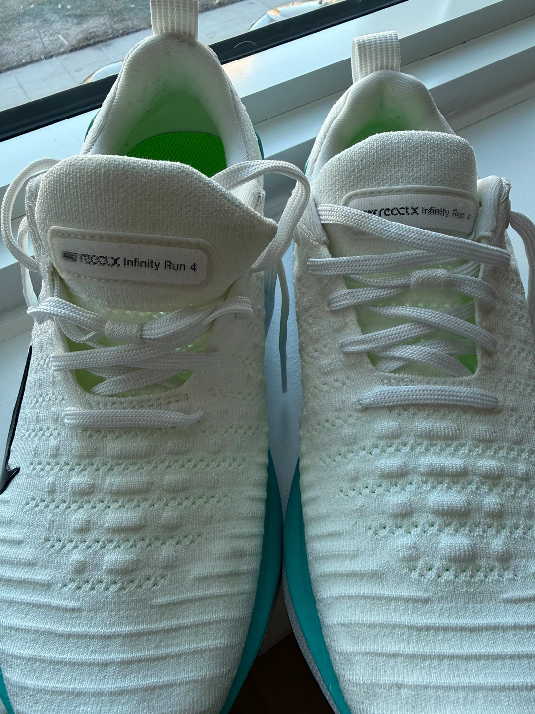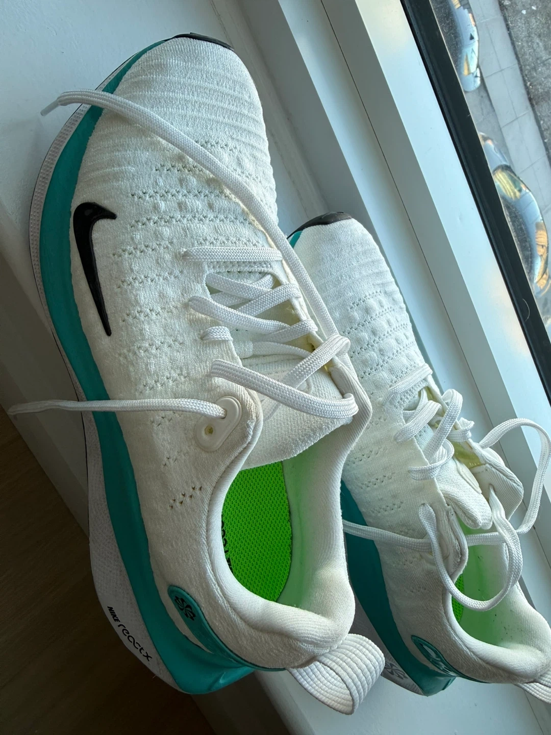 Selling a pair of Nike ReactX Infinity Run 4 running shoes in US size 8.5. They feature a white and teal color scheme.