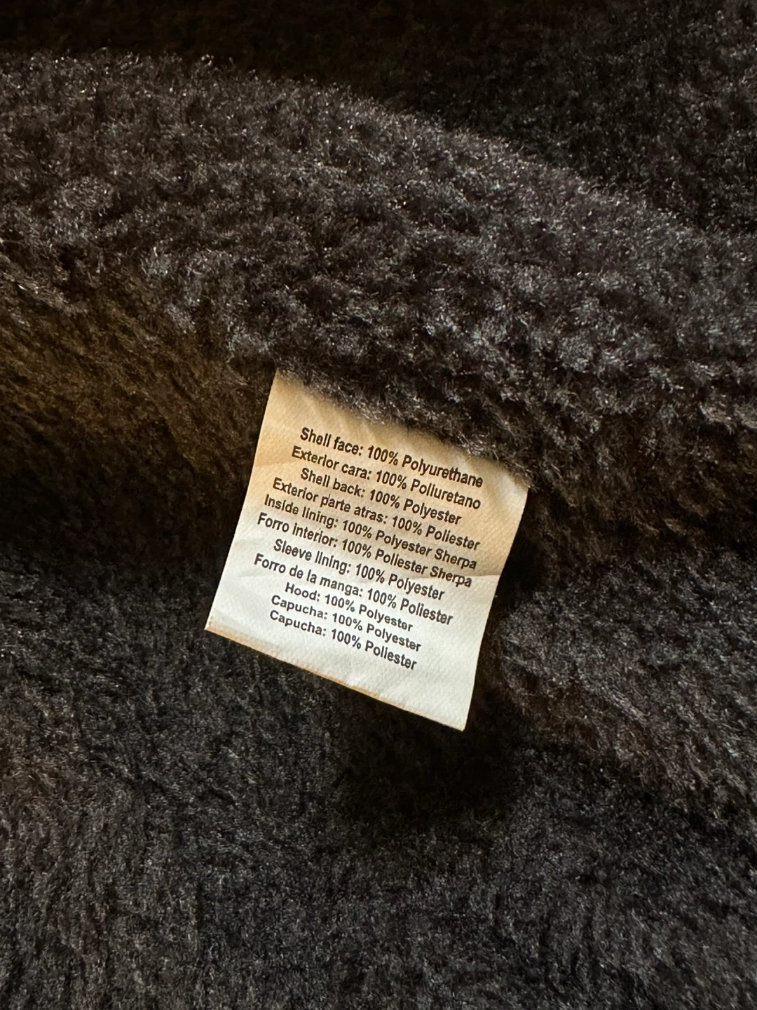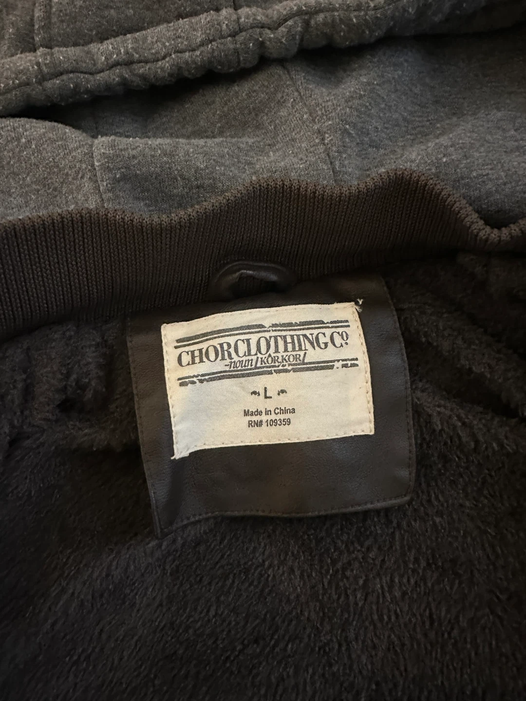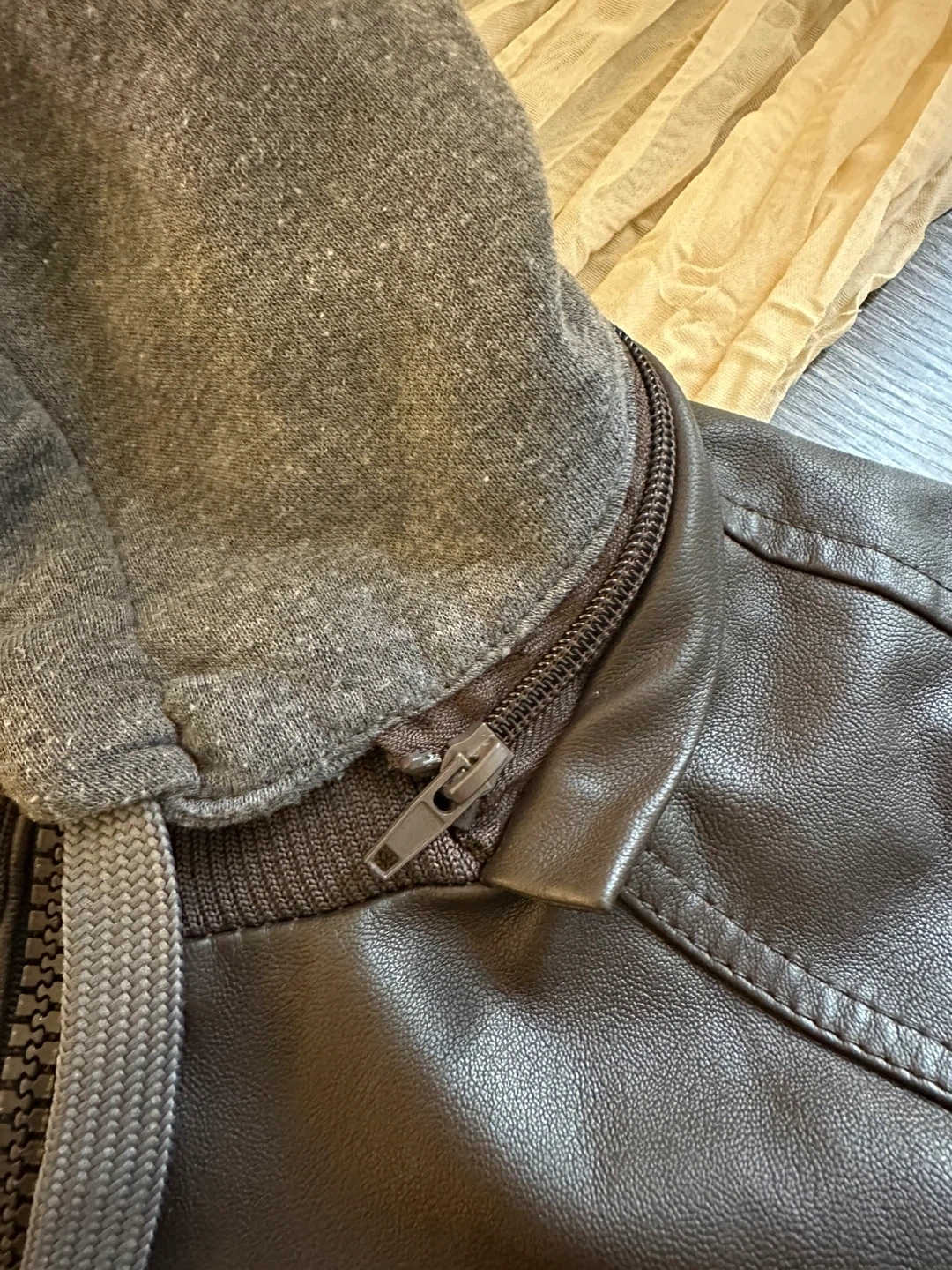 Selling a men’s jacket! It's a brown faux leather jacket with a gray hooded sweatshirt attached. The jacket is a size large and has a soft, warm lining.