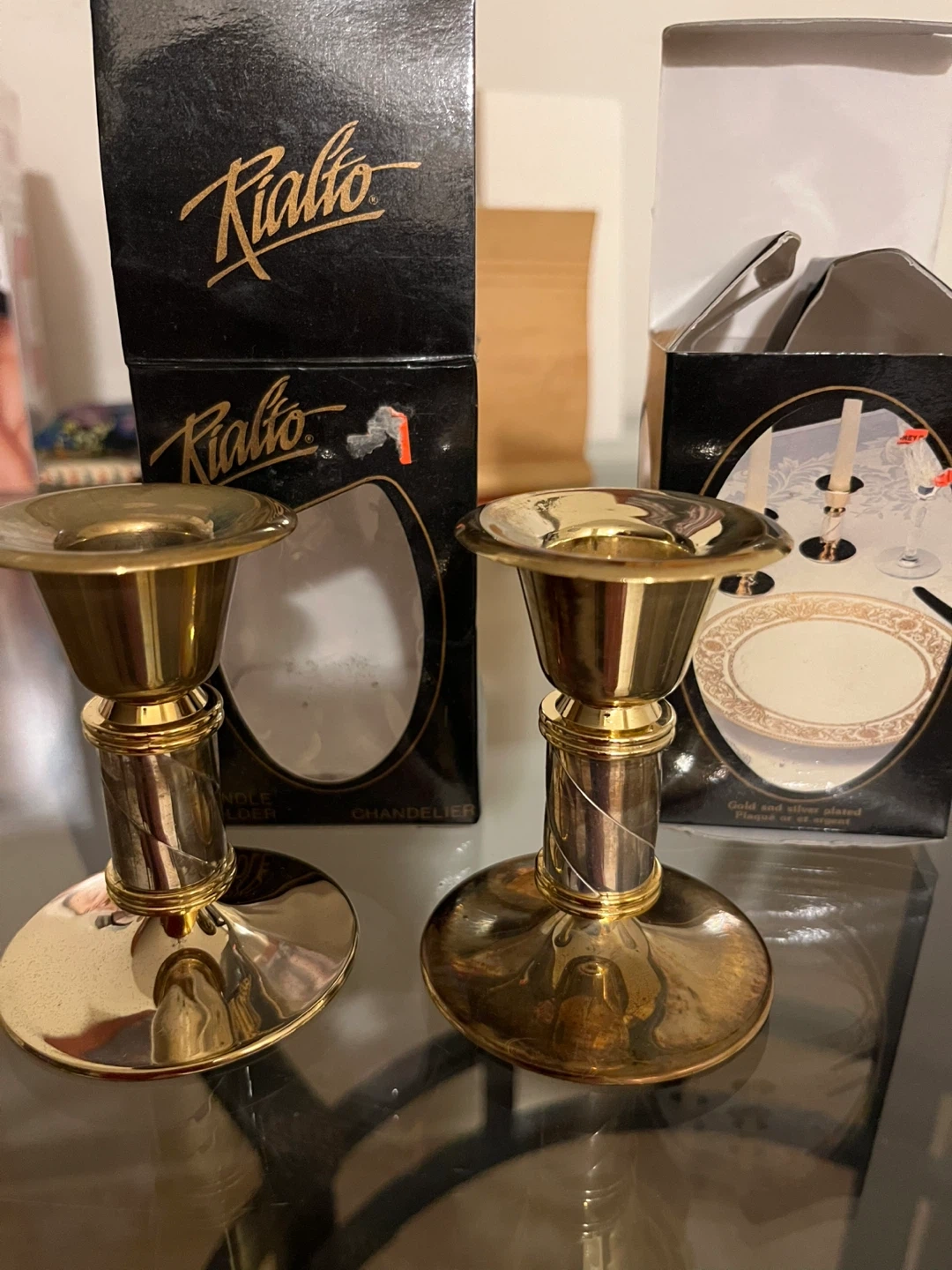 Selling a set of two Rialto candle holders. They are gold in colour, felt on the bottom, 3” tall and come with their original boxes. These candle holders would look great as a centrepiece or on a mantle!