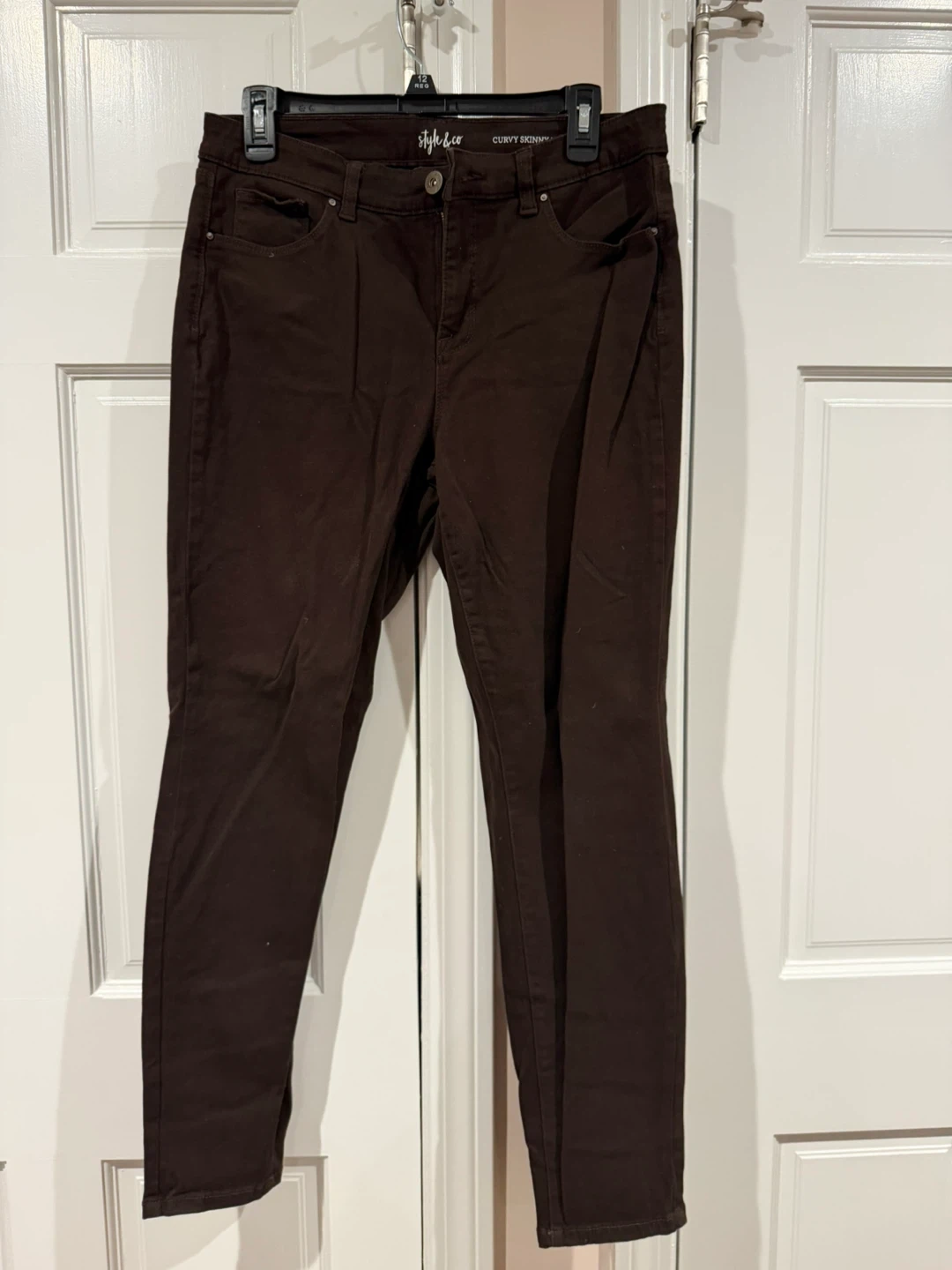 These are a pair of Style&co curvy fit jeans in a rich brown color. They're a size 10 and made from 98% cotton and 2% elastane, offering a comfortable fit.
