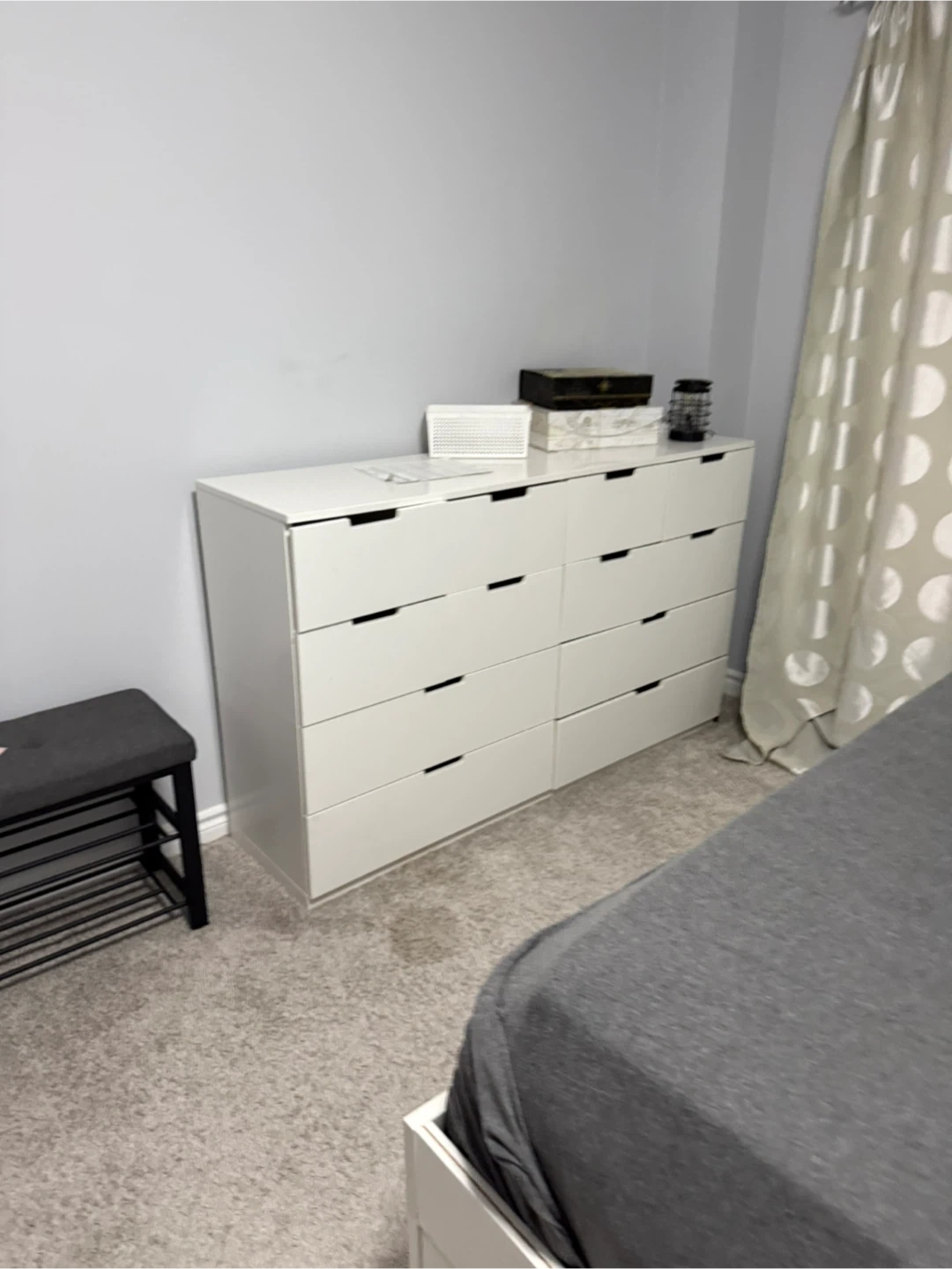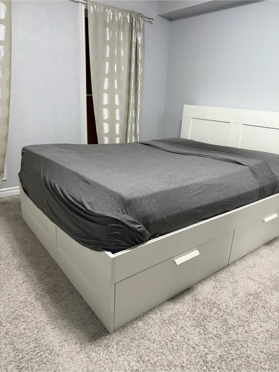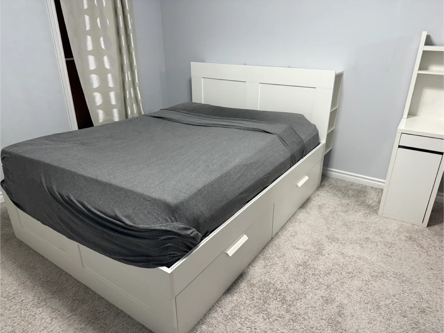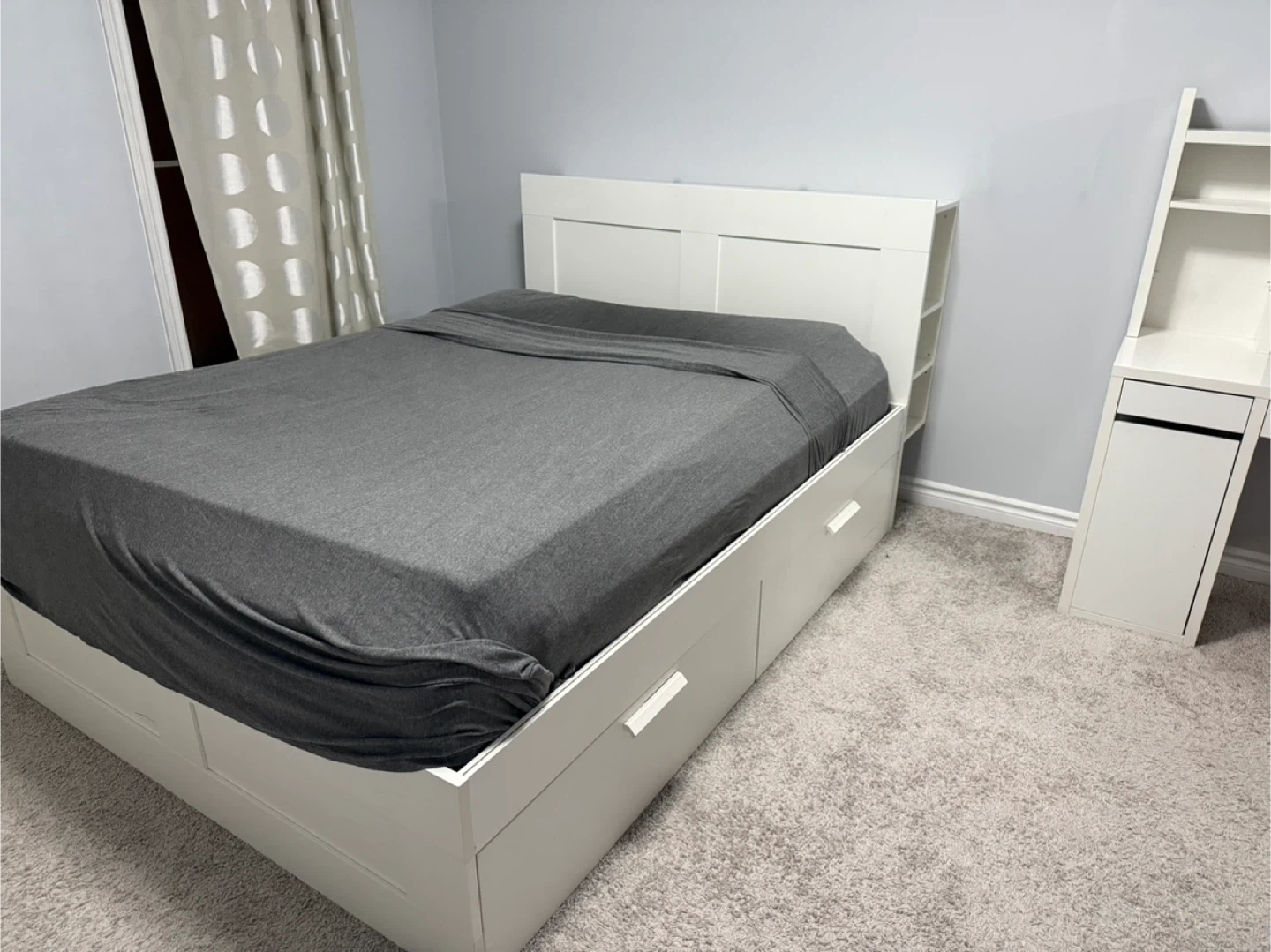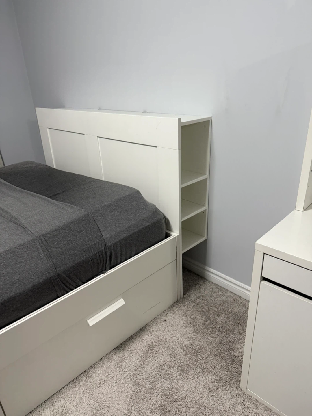 Selling an IKEA bed frame with storage drawers, dresser and a matching desk - all white. Items are in ok condition and would work well for a student space. The bed frame offers great under-bed storage and headboard has open cupboard space on the sides. The desk has a clean, simple design that fits well in any room. The dresser has many drawers and has lots of capacity.