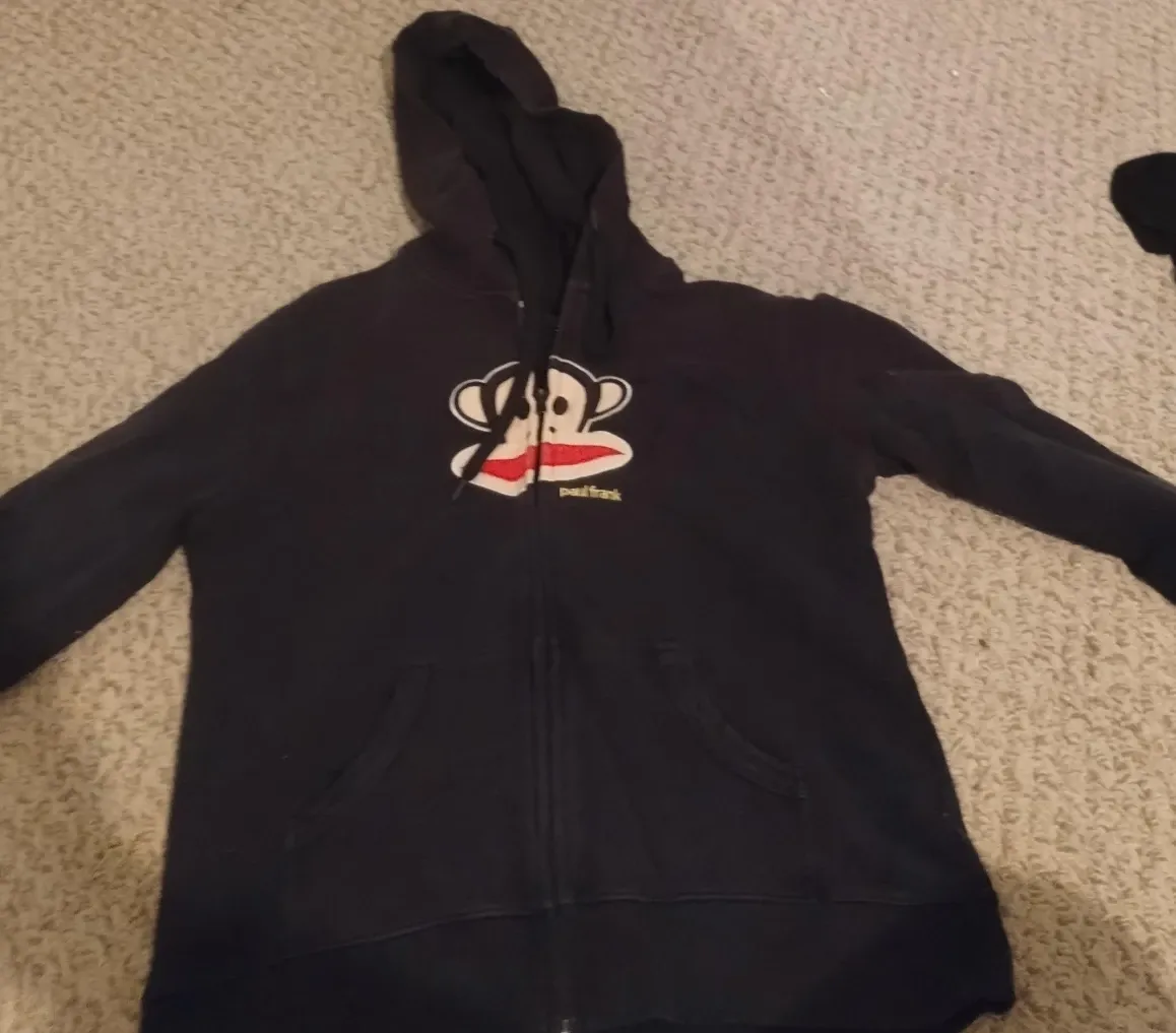 Selling a comfy black zip-up hoodie from Paul Frank! It features the iconic Julius the Monkey logo. Great for layering or just lounging around the house