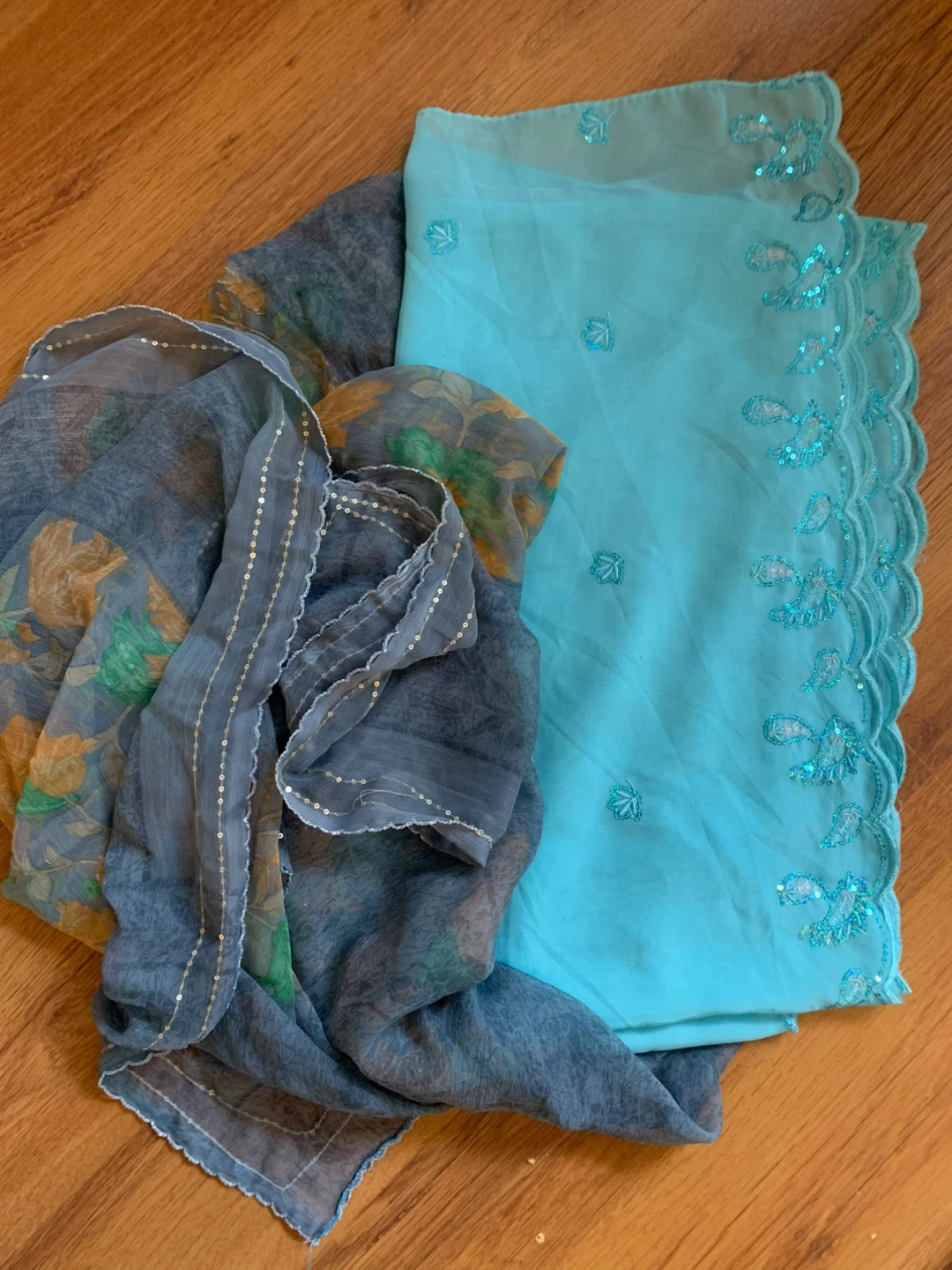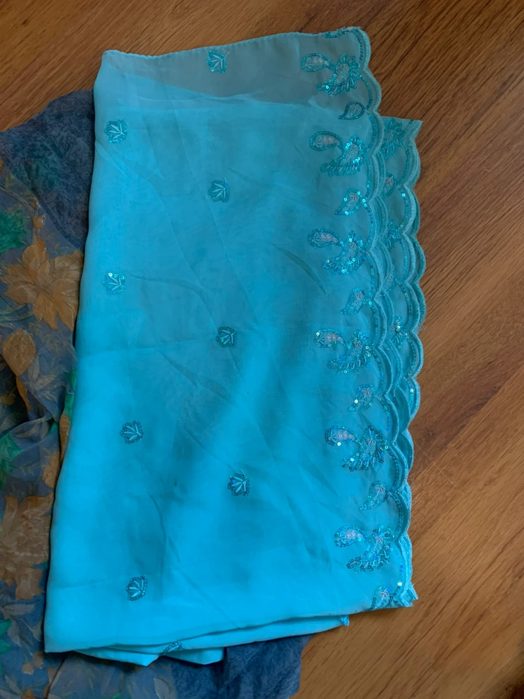 Selling a set of two saris. One is a beautiful blue with floral prints, and the other is a lovely turquoise with delicate sequin detailing. Both are in great condition and ready to add some colour to your wardrobe!