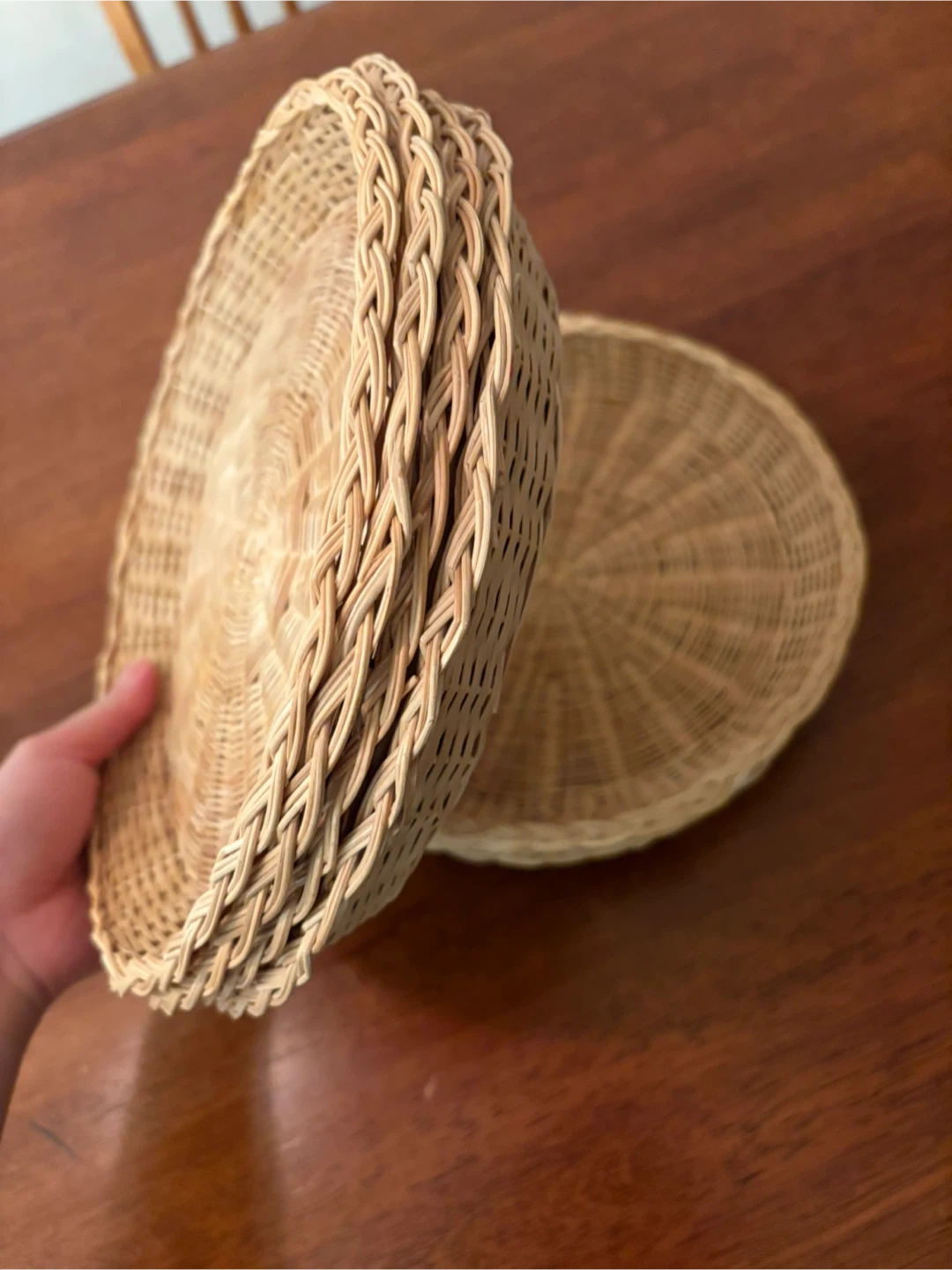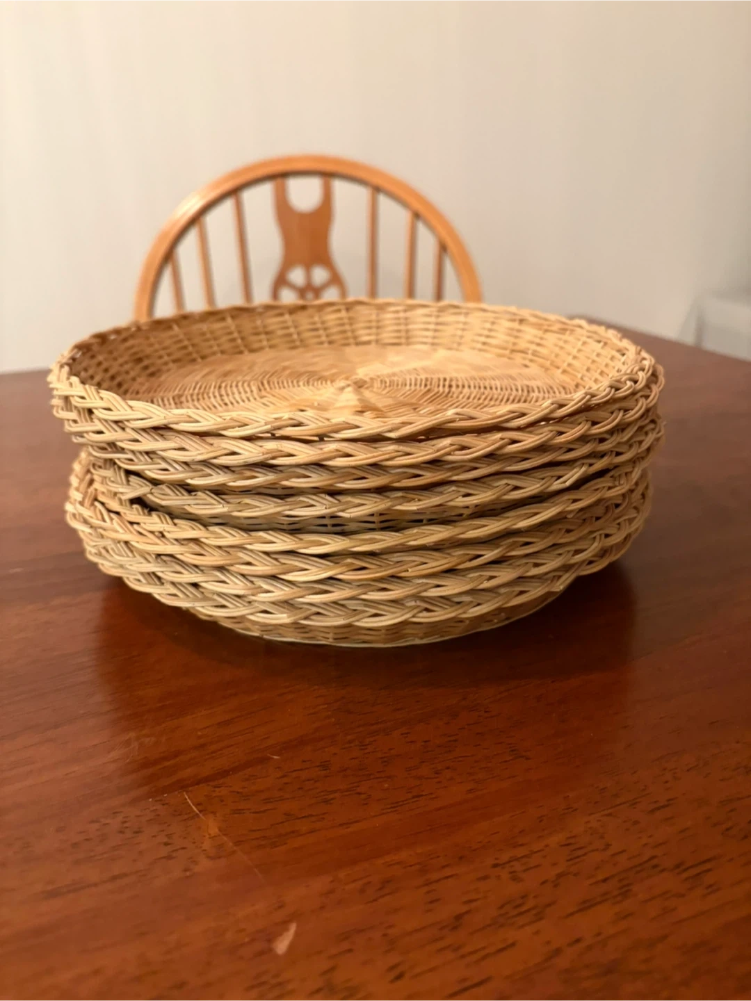 Selling a set of 8 wicker charger plates! They're in great shape and would look lovely on any table setting. Perfect for adding a touch of rustic charm to your dining table. 10” diameter.