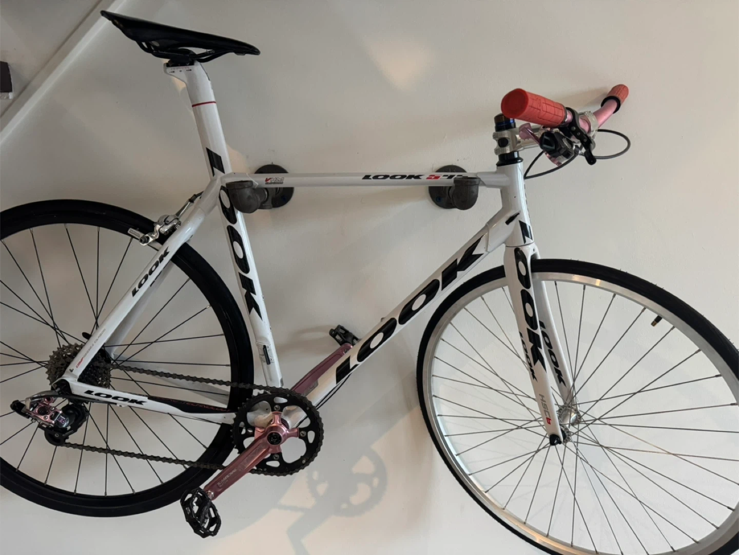 Selling a LOOK 595 road bike. It features a white frame with stylish pink accents. Great for cycling enthusiasts! lots of extra components.