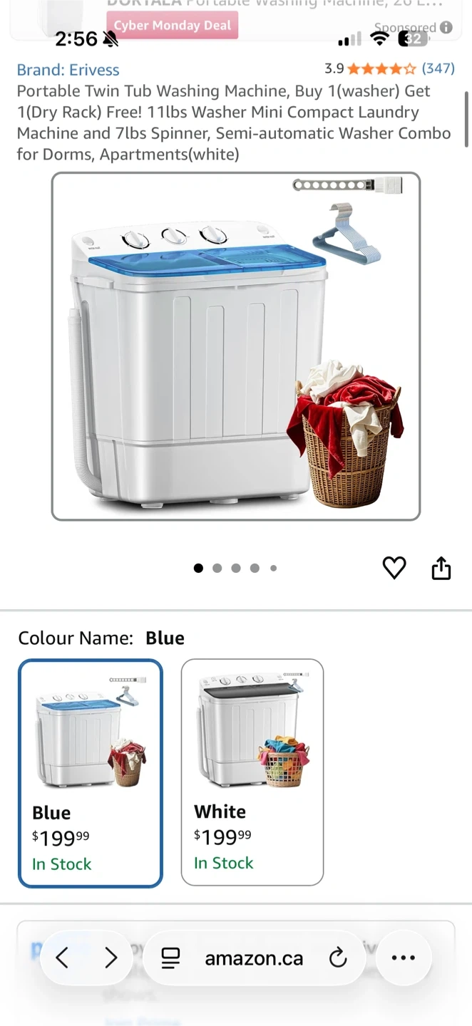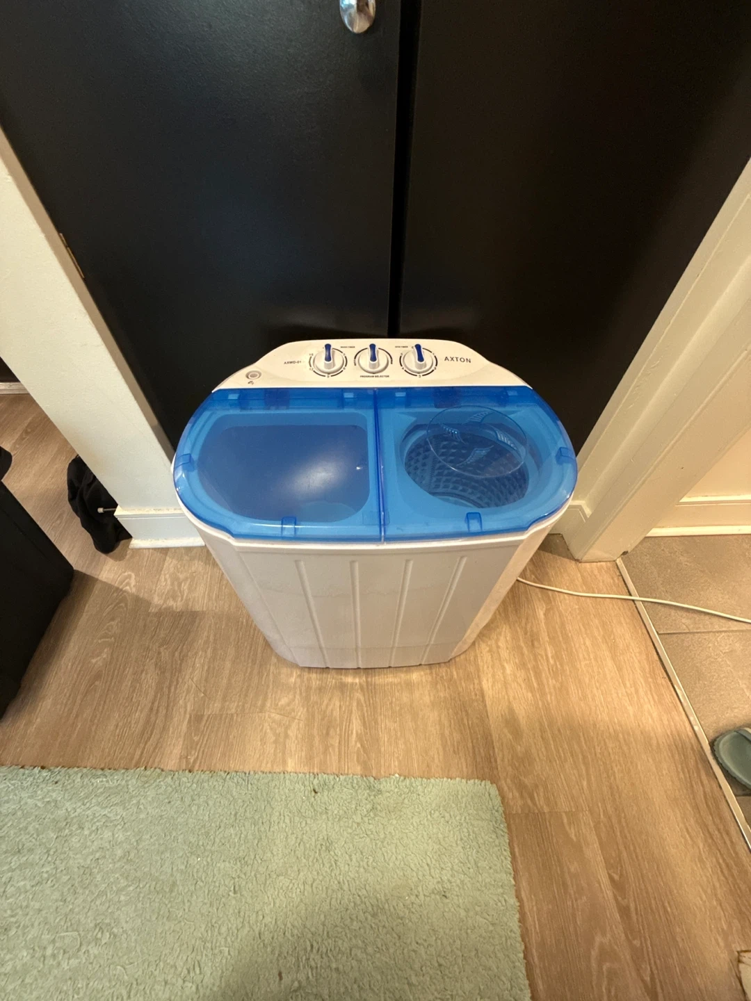 Selling a portable twin tub washing machine by Erivess. It can wash 11lbs and spin 7lbs of laundry. Great for apartments, dorms, or small spaces! The colour is blue. It has a water inlet, inlet pipe collet, filter and spillway